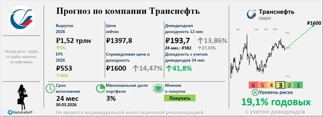 Транснефть выглядит сильнее, чем воспринял рынок: снижение операционной прибыли и убыток в 4 кв в значительной степени обусловлены бумажными обесценениями, которые не отражают ухудшения денежного потока и, как ожидается, будут скорректированы при расчете дивидендной базы. Базовый бизнес остается устойчивым: выручка от основной деятельности растет в рамках индексации тарифов, операционная прибыль до обесценений увеличивается, чистые процентные доходы поддерживают итоговый результат, а текущий уровень дивидендов оценивается как высокий и устойчивый. При этом в ближайшие годы основной драйвер переоценки бумаги, вероятно, будет связан не с ускорением роста бизнеса, а со снижением ставки, тогда как в долгосрочной перспективе дополнительный потенциал создают индексация тарифов и нормализация налоговой нагрузки после 2031 года. С учетом этих факторов я держу акции Транснефти в дивидендном портфеле и рассчитываю получать дивиденды в 2026-2031 гг 13,5-20% годовых.