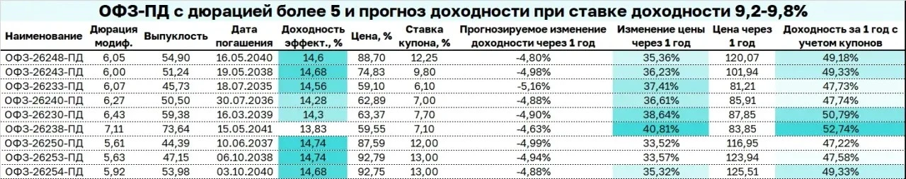 В таблице представлен текущий прогноз по цене облигаций через 1 год, а также доходность этих облигаций при изменении ставки эффективной доходности с ~14,5% до 9,2-9,8% за 1 год с учетом купонов.