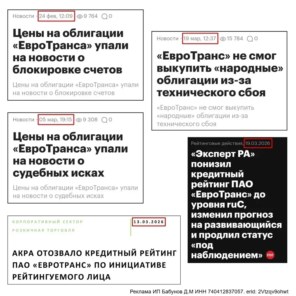 Отличный пост на эту тему вышел у моего коллеги Клима. Он подробно разобрал ситуацию с облигациями Евротранса, оценил их денежные потоки и объяснил, когда ждать дефолт. Рекомендую почитать.