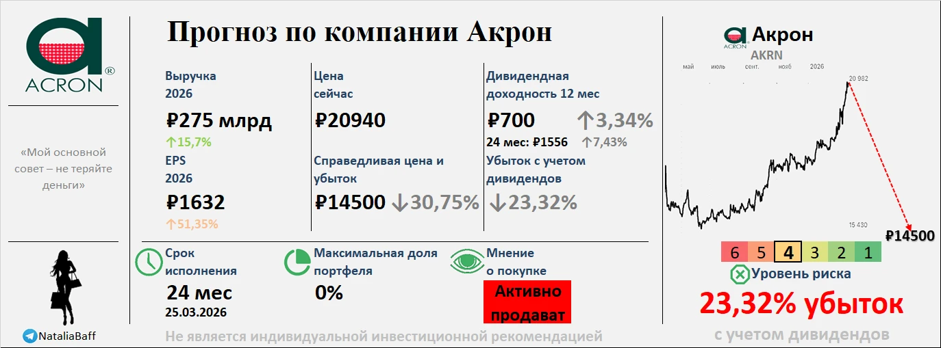 Акрон выглядит качественным, но на текущих уровнях переоцененным активом. Компания сохраняет сильные позиции в отрасли, однако рыночная оценка уже отражает эти преимущества. Дополнительным сдерживающим фактором выступают слабая предсказуемость свободного денежного потока на фоне высоких капитальных затрат, зависимость финансового результата от конъюнктуры мирового рынка удобрений, крепкий рубль и низкая дивидендная привлекательность. Также настораживают низкий free-float, ограниченная прозрачность в коммуникации с миноритариями и в целом не самый комфортный для инвестора профиль корпоративного управления.