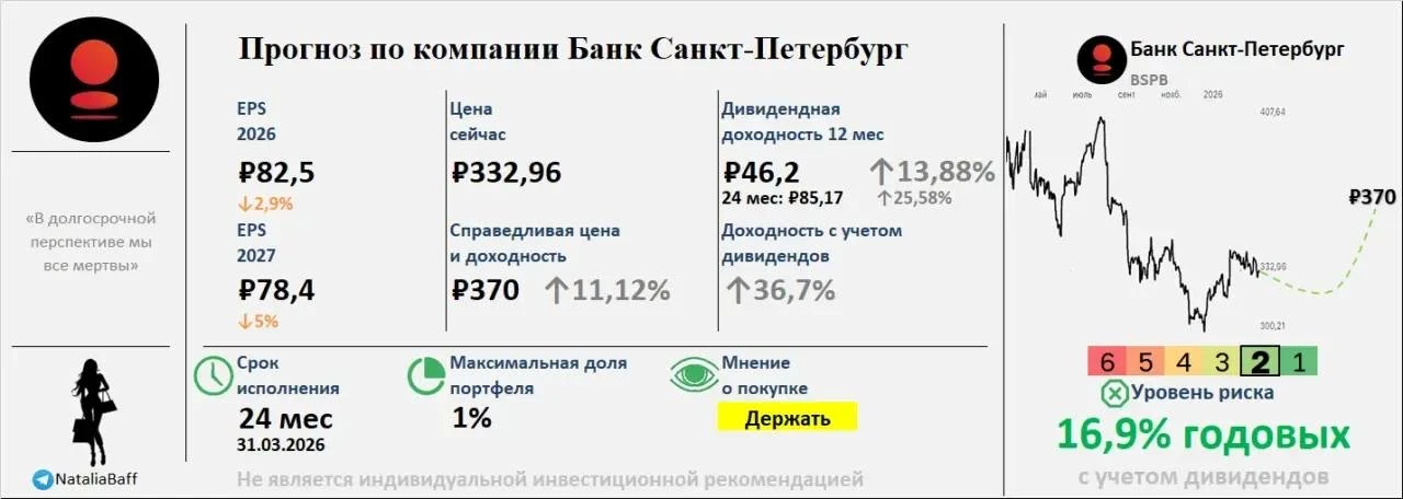 Банк Санкт-Петербург можно оценить как устойчивый и качественный частный банк с сильной операционной базой, высокой рентабельностью и стабильной способностью генерировать прибыль, что создает основу для сохранения регулярных дивидендных выплат. Вместе с тем после очень сильных результатов 2022–2024 годов финансовые показатели, вероятно, перейдут к более умеренной траектории: прогнозный EPS на 2026–2027 гг составляет 82,50 руб. и 78,37 руб. соответственно, а форвардный P/E находится на уровне 3,9–4,3, что указывает на близкую к справедливой текущую оценку без выраженного потенциала переоценки. С учетом этого акции банка на текущих уровнях в большей степени выглядят как инструмент получения стабильного дивидендного дохода, чем как идея на существенный рост капитализации. Прогнозируемая дивидендная доходность в ближайшие три года составляет около 12,9% по итогам 2025 года, 12,0% по итогам 2026 года и 11,4% по итогам 2027 года.