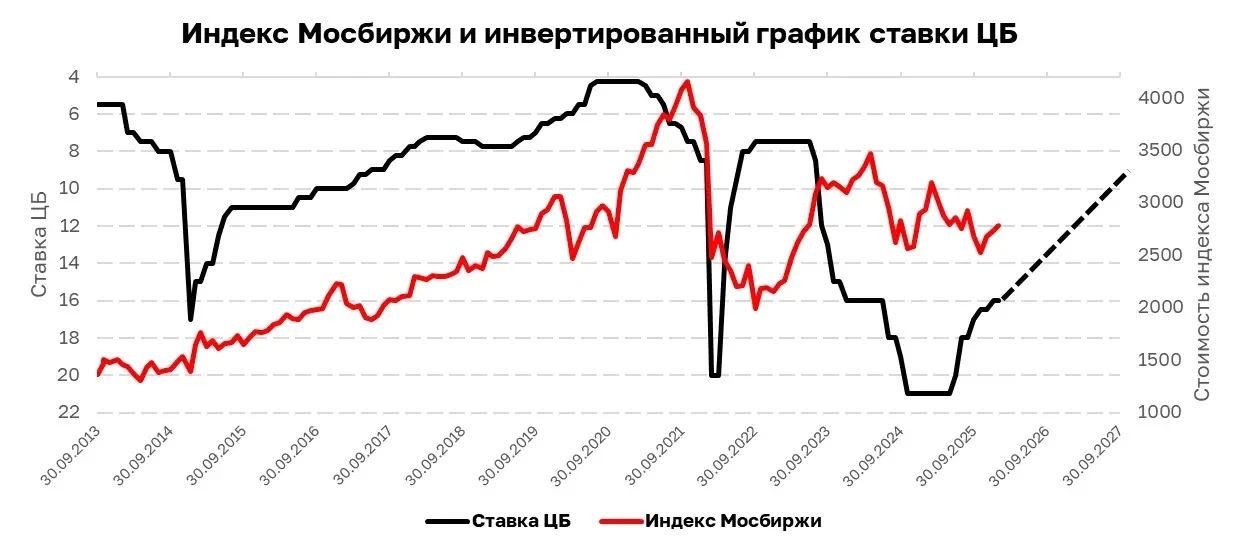 На представленном графике сопоставлена динамика индекса Мосбиржи и инвертированного значения ключевой ставки Банка России. Визуально может показаться, что снижение ставки автоматически создает благоприятные условия для роста фондового рынка. Однако такая интерпретация является упрощенной.