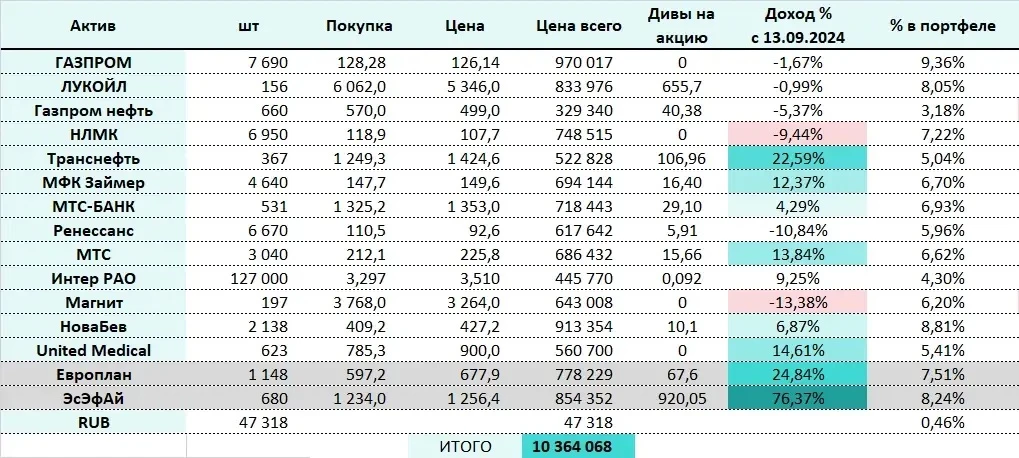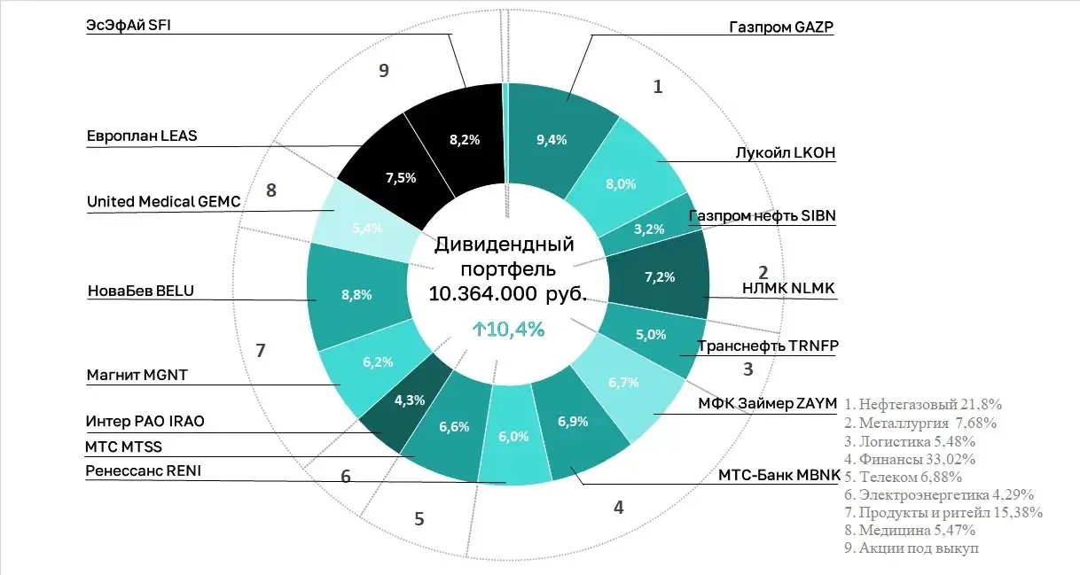 Потенциал портфеля с учетом дивидендов составляет 32,65%. Дивидендная доходность портфеля за год может составить порядка 13,1%, при условии, если Газпром, НЛМК и Магнит возобновят выплаты в 2026 году, а также если Европлан и ЭсЭфАй выкупят по заявленной цене в полном объеме, а деньги будут реинвестированы мной в другие компании.