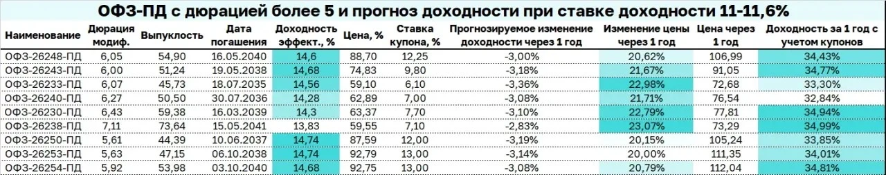 В таблице представлен текущий прогноз по цене облигаций через 1 год, а также доходность этих облигаций при изменении ставки эффективной доходности с ~14,5% до 11-11,6% за 1 год с учетом купонов.