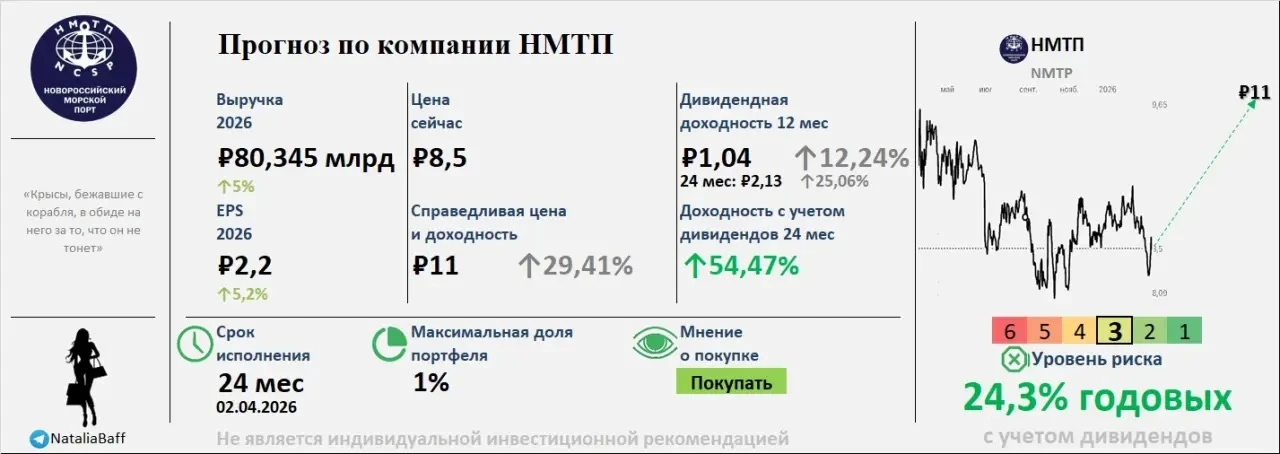 НМТП оценивается рынком на 164 млрд руб., при этом зарабатывает более 40 млрд руб., что выглядит привлекательно. НМТП имеет отрицательный чистый долг, что в текущих макроэкономических условиях является важнейшим показателем для инвестора, также это будет влиять на положительные решения по дивидендам, что немало важно для российского рынка. Кроме того, НМТП ведет строительство перегрузочного комплекса в порту Новороссийска, который позволит существенно увеличить грузооборот. Компания выглядит привлекательно для консервативного инвестора.