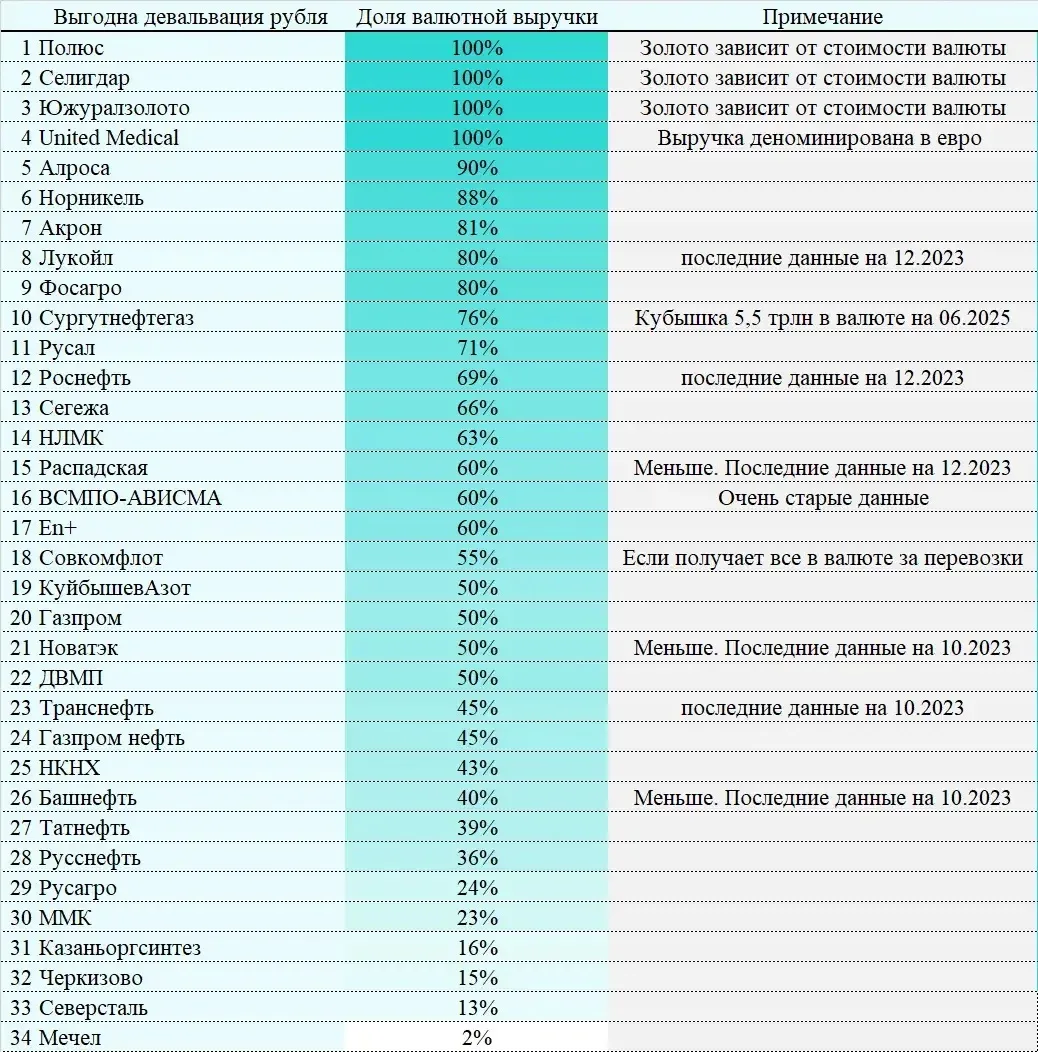 Конечно, девальвация рубля выгодна экспортноориентированным компаниям. Таблица наглядно демонстрирует долю валютной выручки компаний РФ, где можно увидеть, что многие компании имеют значительную долю доходов в валюте.