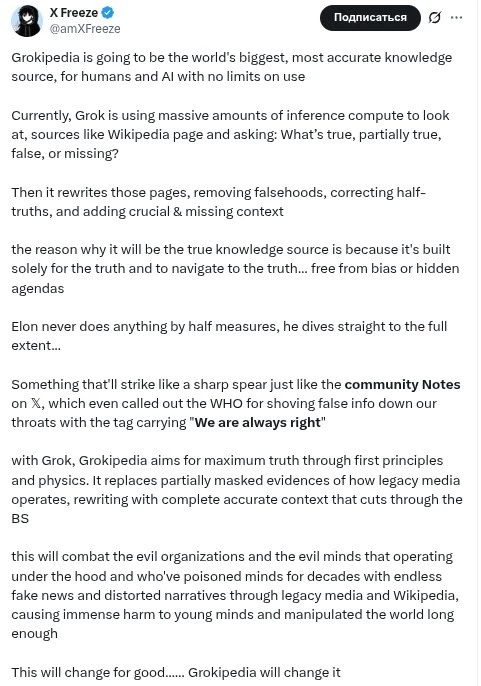 По сути, это будет та же Википедия, переписанная самим Grok’ом: он будет смотреть на статьи и решать, что правда, что ложь, что требует правки. А потом заново писать их "в духе истины".