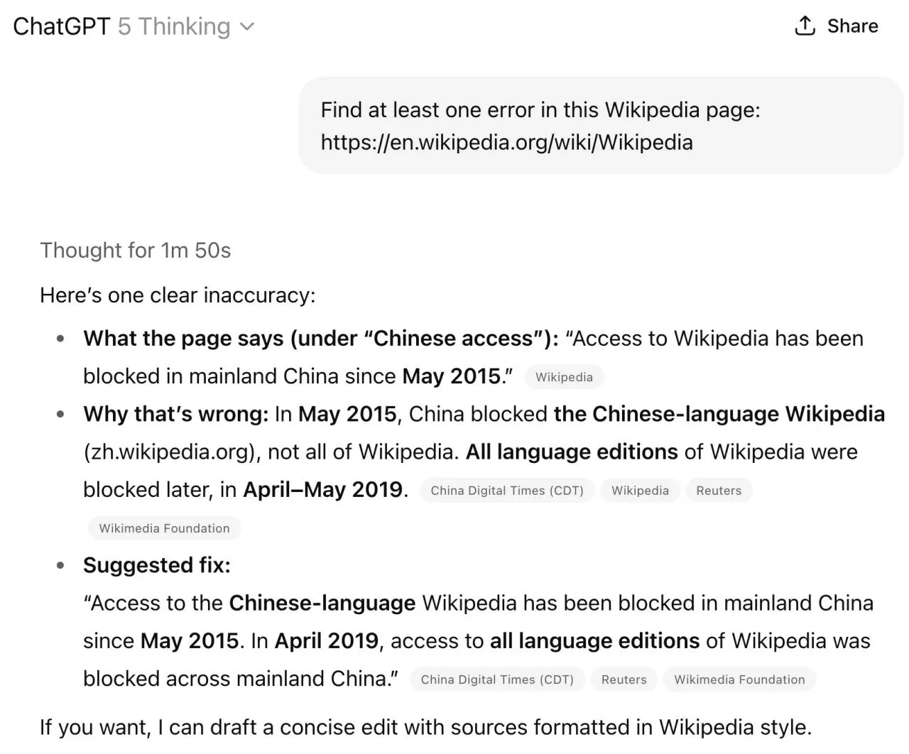 Наткнулся в твиттуре на занятный пост. Суть: чувак пишет, что его новое хобби — скармливать рандомные статьи из Википедии GPT-5 Thinking и просить найти ошибки. И оно вроде как реально находит их. Много. И даже в статье про саму википедию.