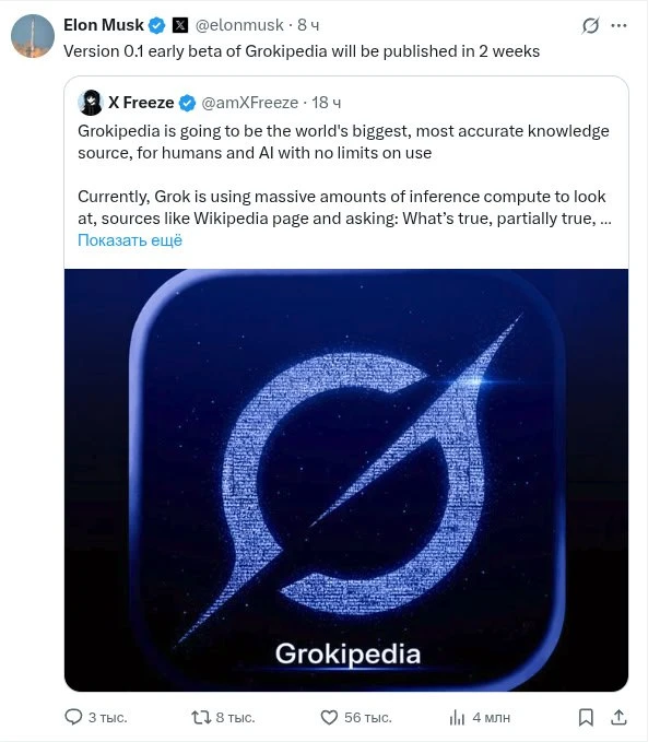 Илон Маск пообещал, что через пару недель покажет прототип Грокипедии, "самый точный источник знаний для людей и ИИ".
