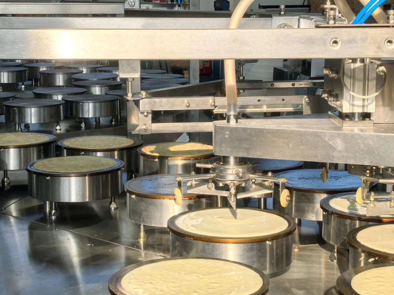 Оператор задаёт параметры — температуру чугунной жарочной поверхности и режим работы. Дальше линия работает сама: наливает тесто, распределяет его, переворачивает. Каждый блинчик жарится 2 минуты.