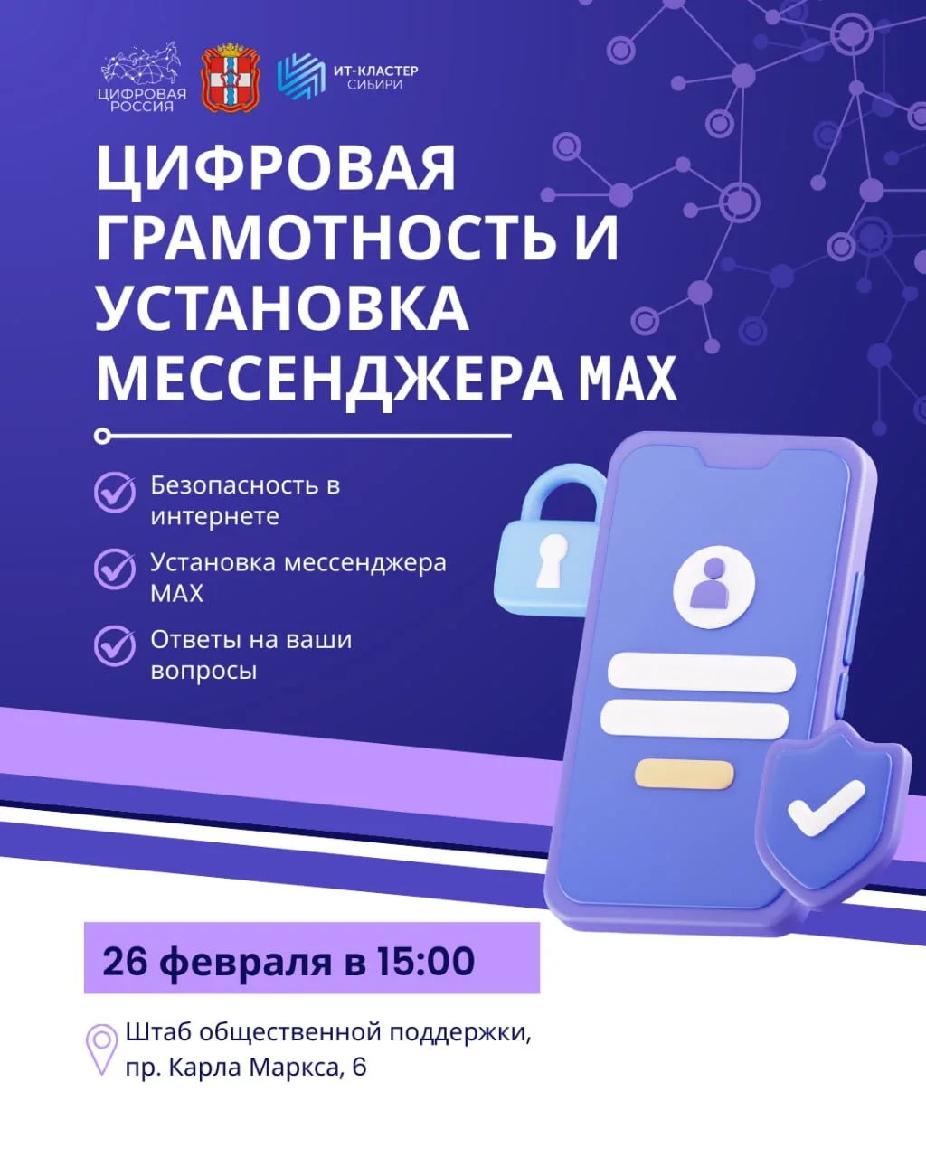 В рамках федерального партийного проекта «Цифровая Россия» при поддержке Министерства цифрового развития и связи Омской области и Ассоциации «ИТ-Кластер Сибири» состоится просветительское мероприятие, посвящённое вопросам цифровой грамотности и безопасного использования современных цифровых сервисов.