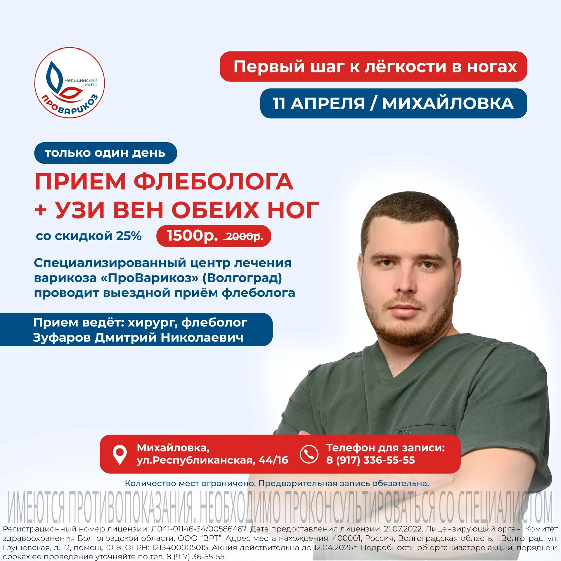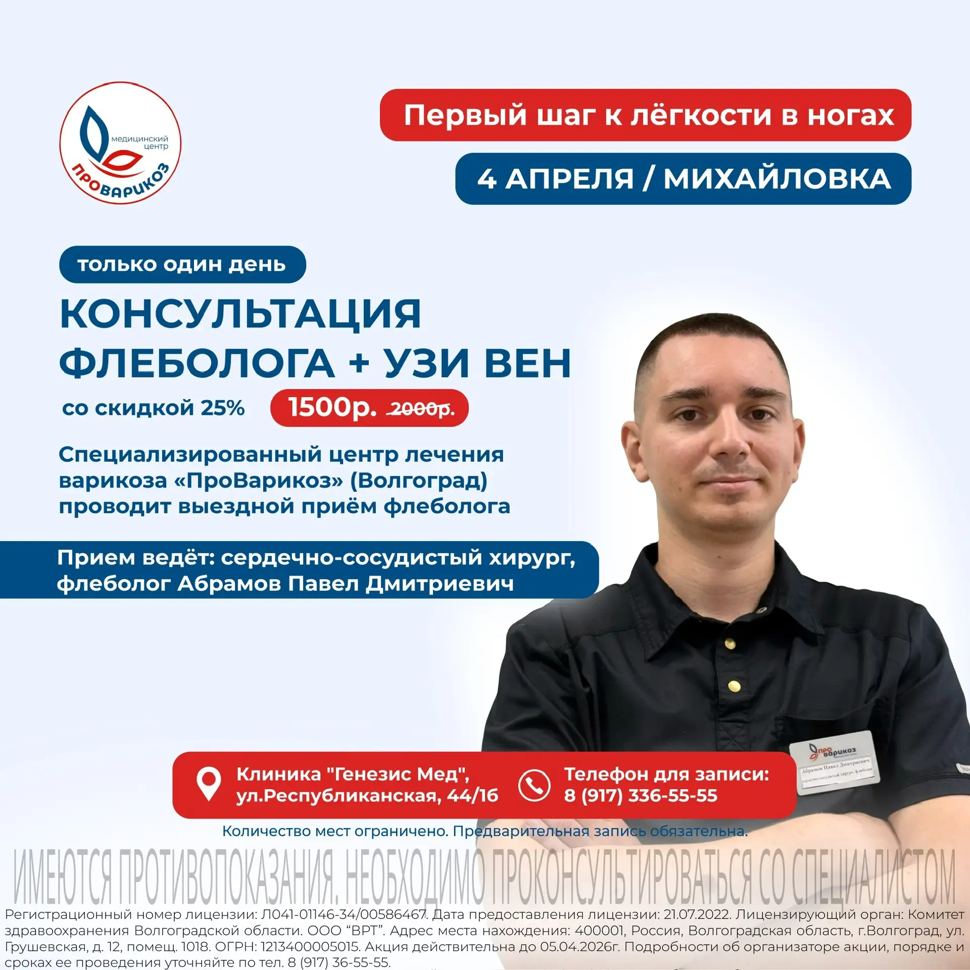 ☝🏼 Только 4 апреля в Михайловке ведёт приём сердечно-сосудистый хирург, флеболог из медицинского центра «ПроВарикоз» (Волгоград) — Абрамов Павел Дмитриевич.