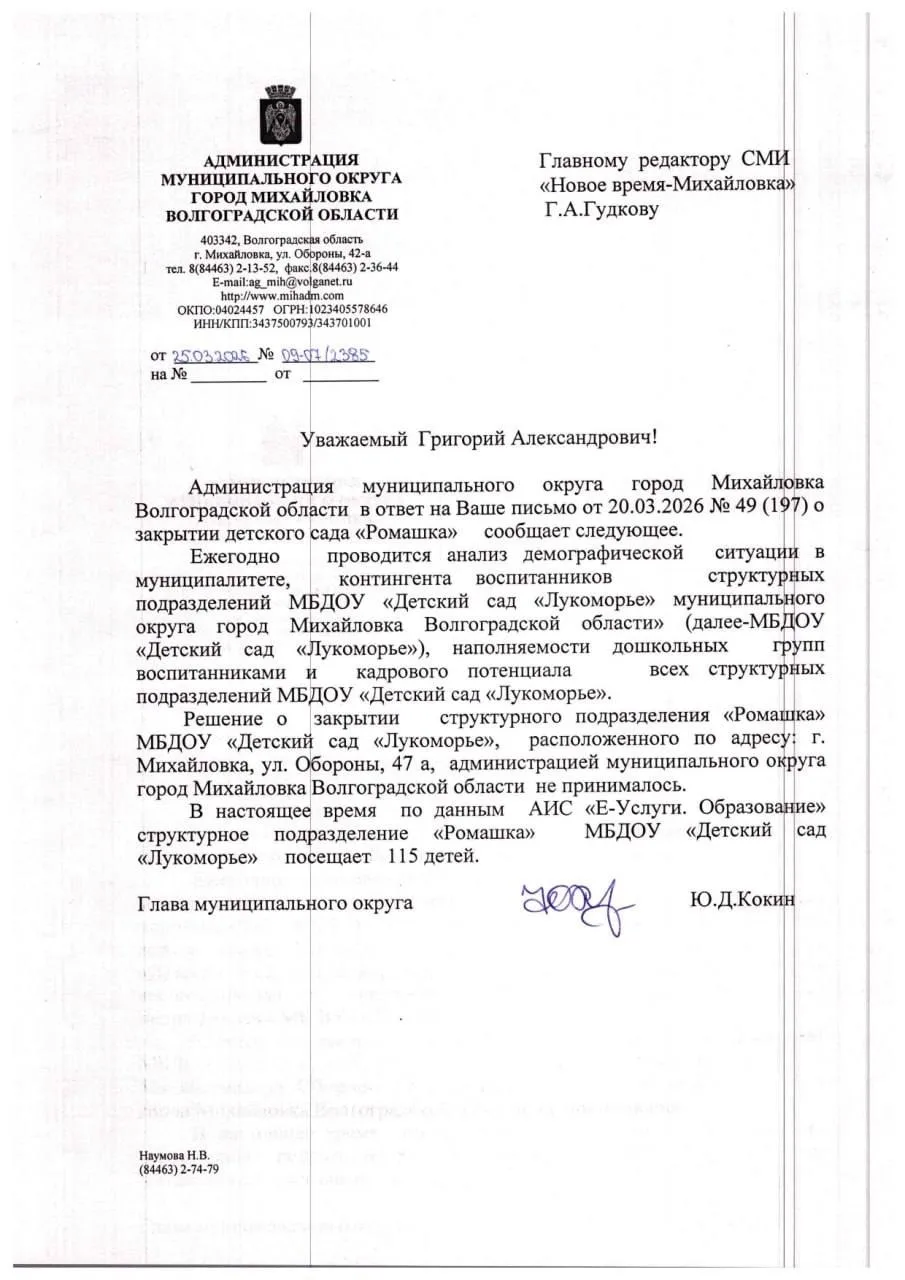 Начальник отдела образования городского округа город Михайловка Надежда Наумова официально опровергла информацию о ликвидации детского сада «Ромашка». Об этом сообщается в ответе на запрос редакции «Новое время Михайловка» о судьбе дошкольного учреждения.