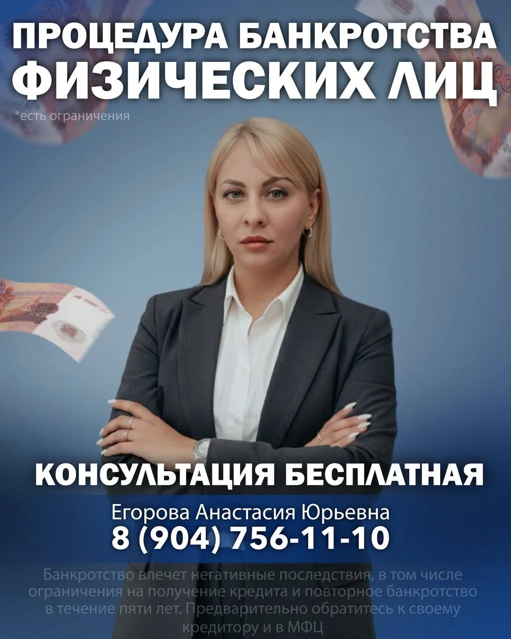 Оказались в сложной финансовой ситуации: долги,просрочки, пени, штрафы? Есть разные правовые решения, например банкротство физлиц. Можно пройти процедуру банкротства бесплатно (если подходите под условия) или с моим юридическим сопровождением.