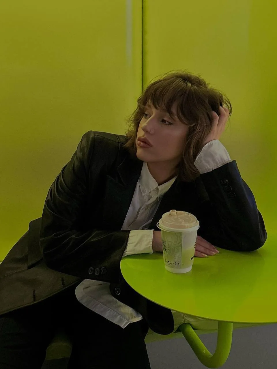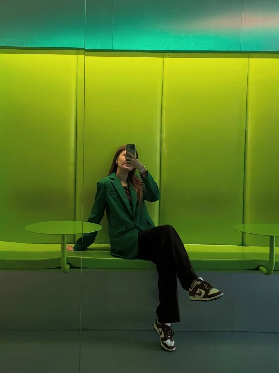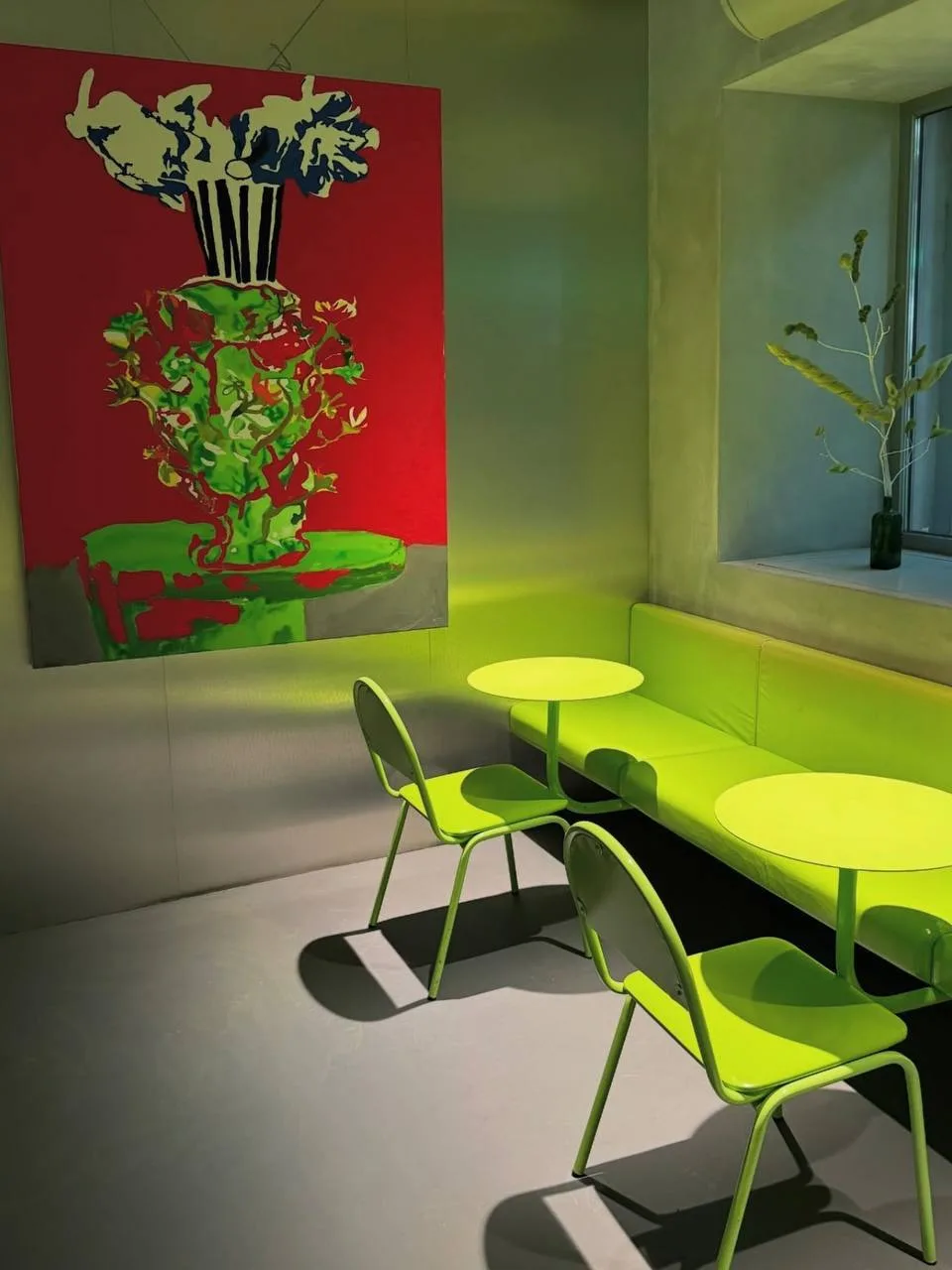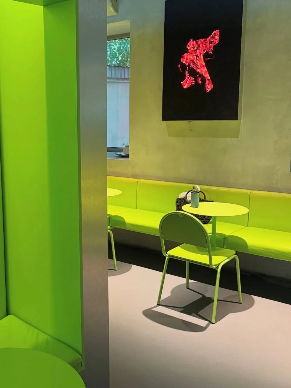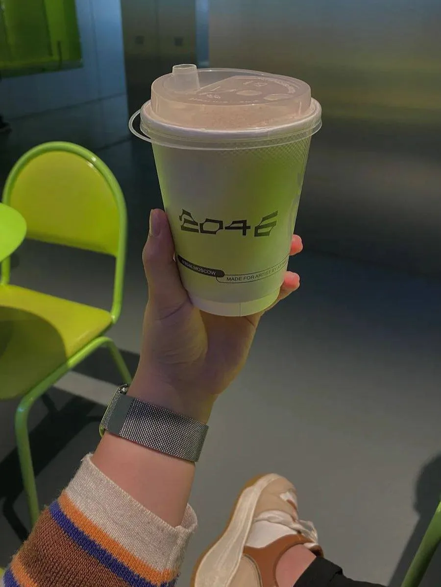 В кофейне «2046» — металл, неон и ярко‑зелёные акценты. Идеальный фон для стильных кадров 🔥