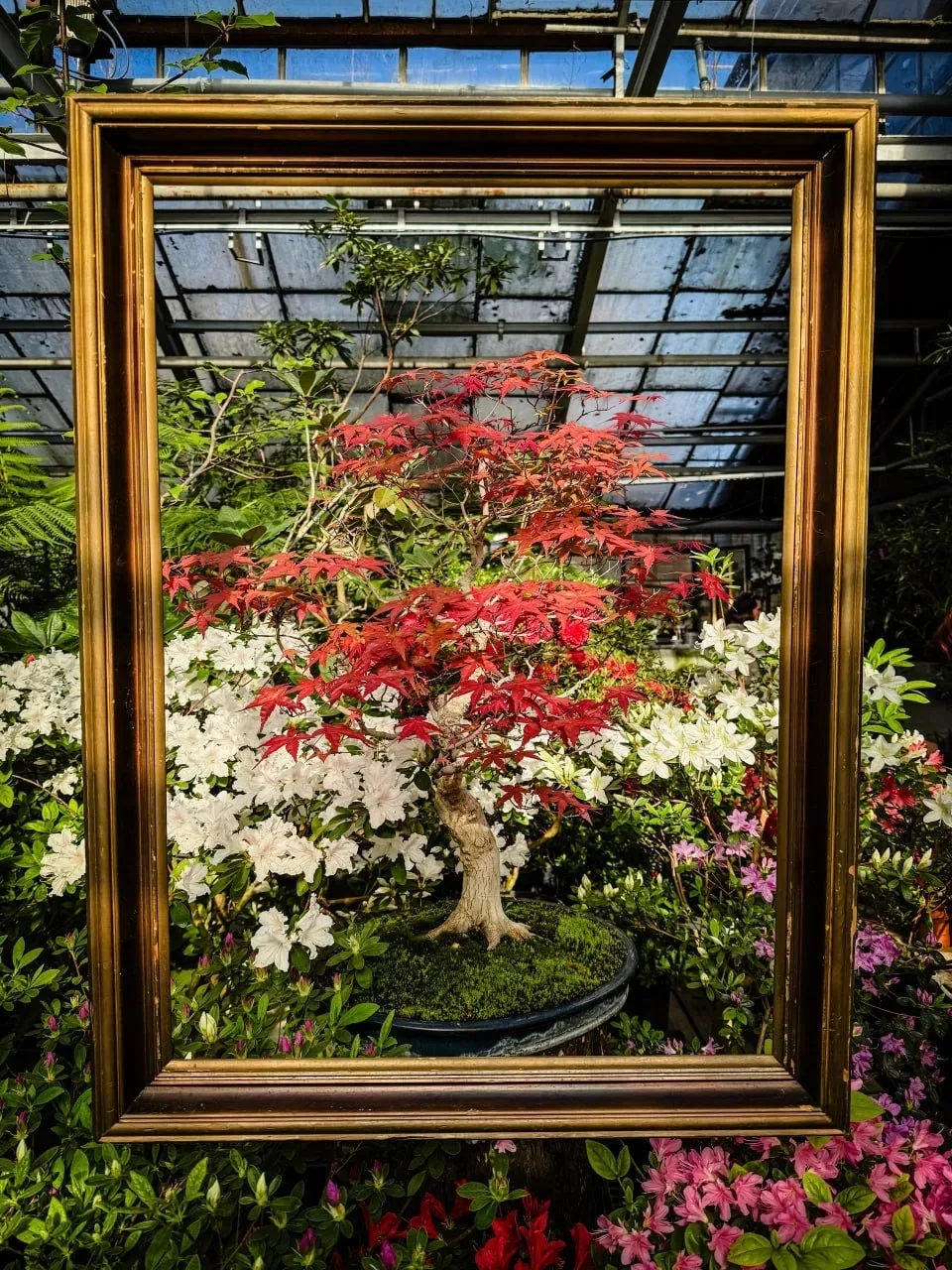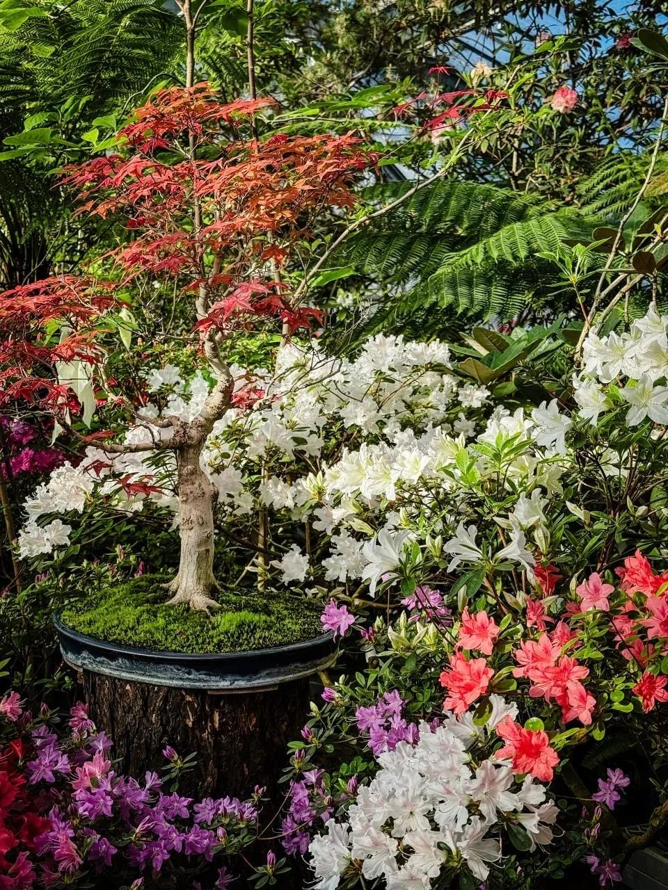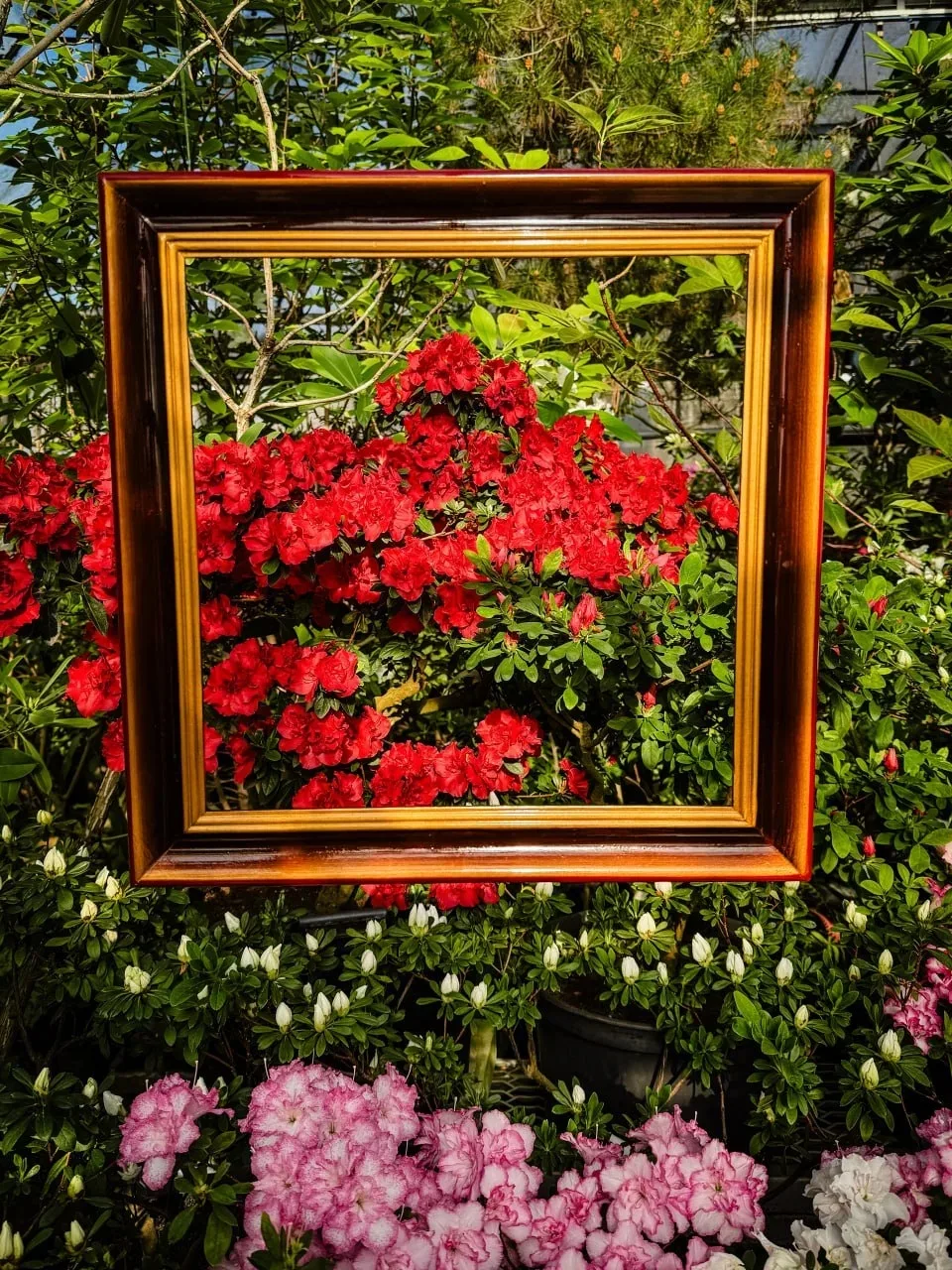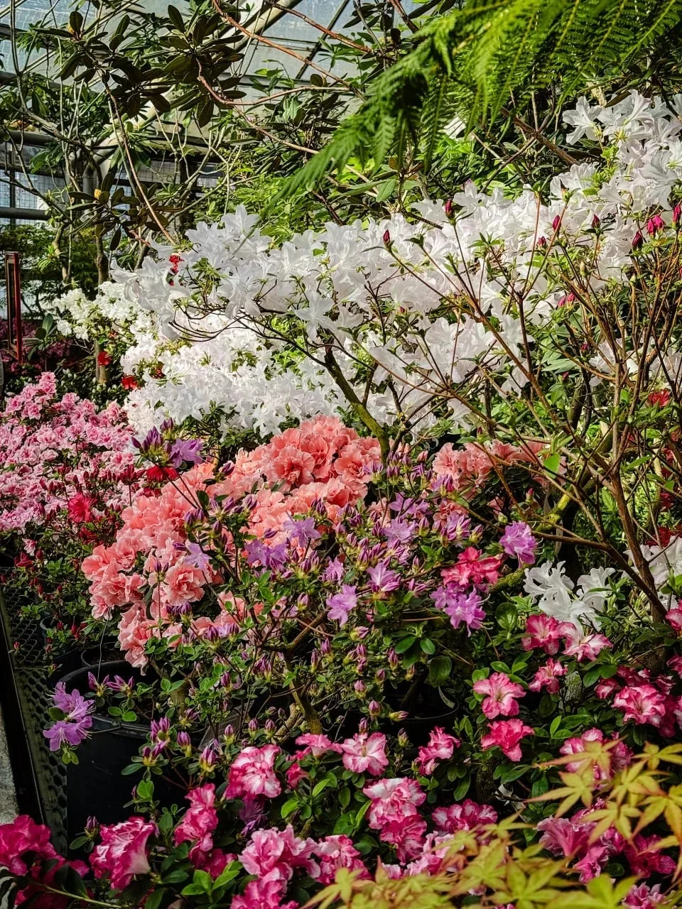Экспозиция расположена в зале, который обычно закрыт для посетителей — и именно сейчас его можно увидеть. Здесь собраны десятки сортов азалий: от нежных пастельных до насыщенно ярких, с разными формами лепестков и оттенками.