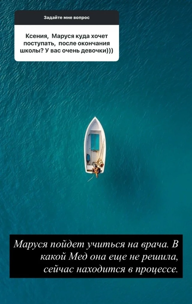 «Маруся пойдет учиться на врача. В какой мед, она еще не решила, сейчас находится в процессе», – написала телеведущая в Strories, отвечая на вопросы подписчиков.