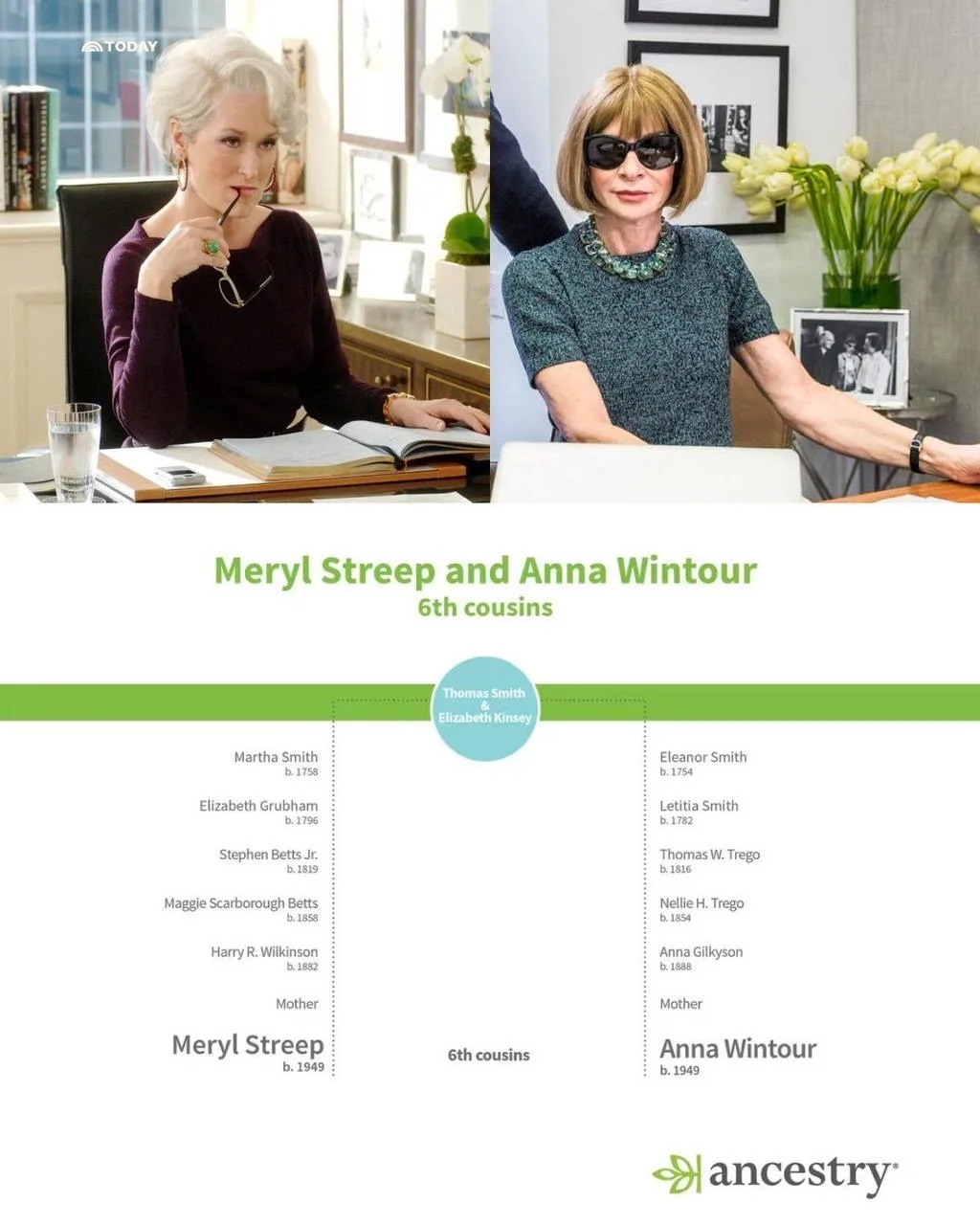 Сервис Ancestry установил, что Мэрил Стрип и Анна Винтур являются шестироюродными сестрами. У них общие предки в лице дедушки и бабушки — Томаса Смита и Элизабет Кинси. Теперь понятно, почему актрисе удалось настолько хорошо сыграть роль Анны в фильме «Дьявол носит Prada».
