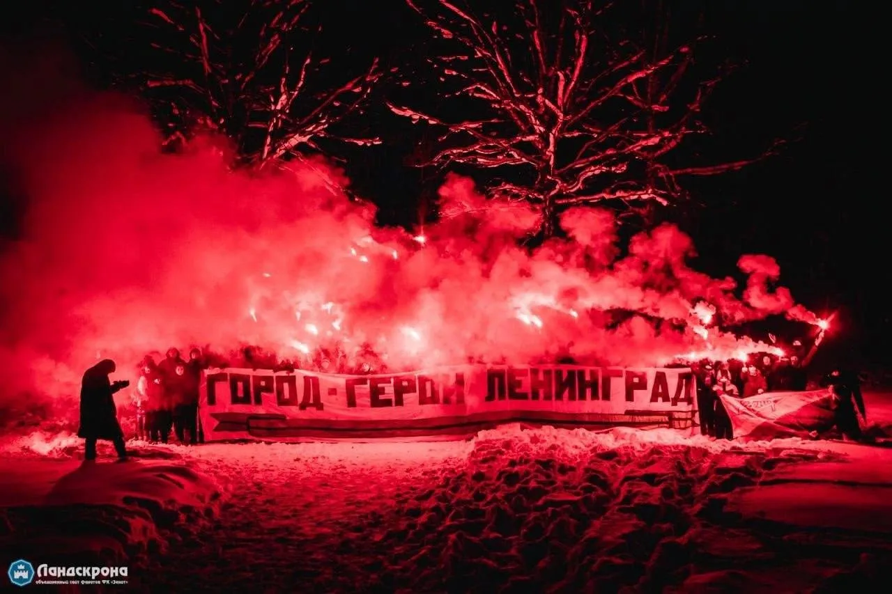 Фанаты зажгли фаеры в день годовщины прорыва блокады Ленинграда. На мемориале «Цветок жизни» также возложили цветы.