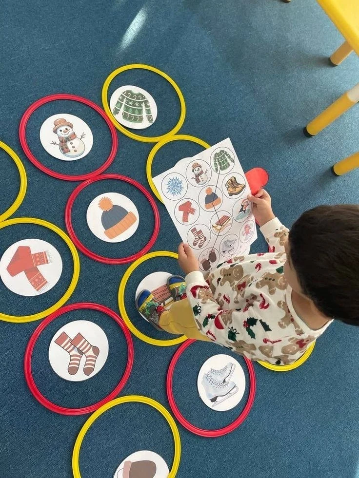 Выкладываем обручи сеткой размером 3*4. В обручи размещаем картинки в соответствии с картами.