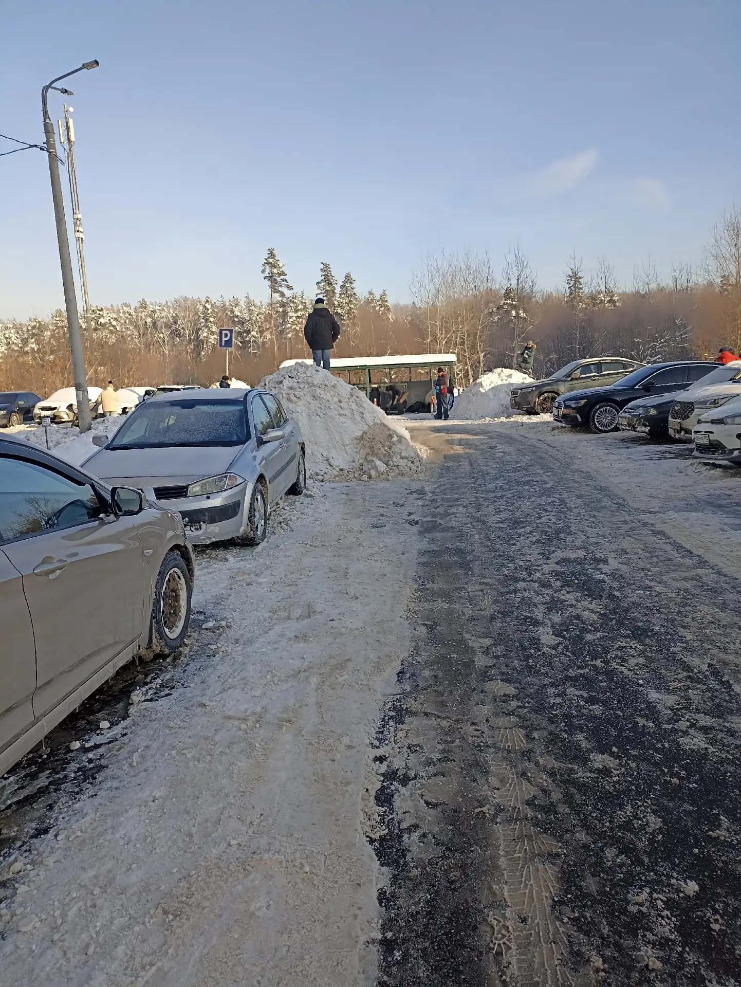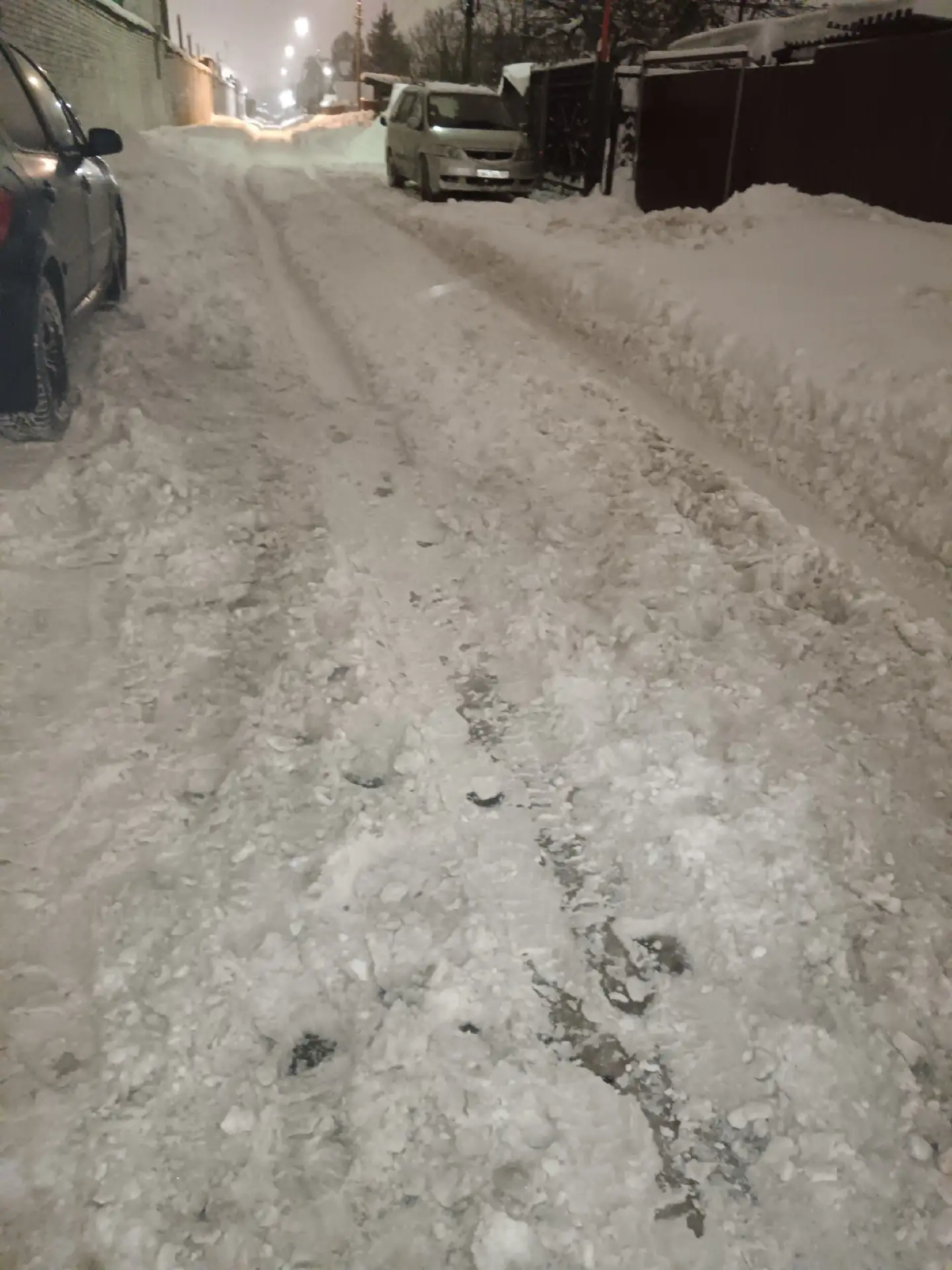 Здесь невозможно не только припарковаться, но даже проехать по дворам, не задев «кого-нибудь»… уже не говоря о том, что и пешеходам очень сложно передвигаться – под рыхлым снегом голый лед, идут и падают.