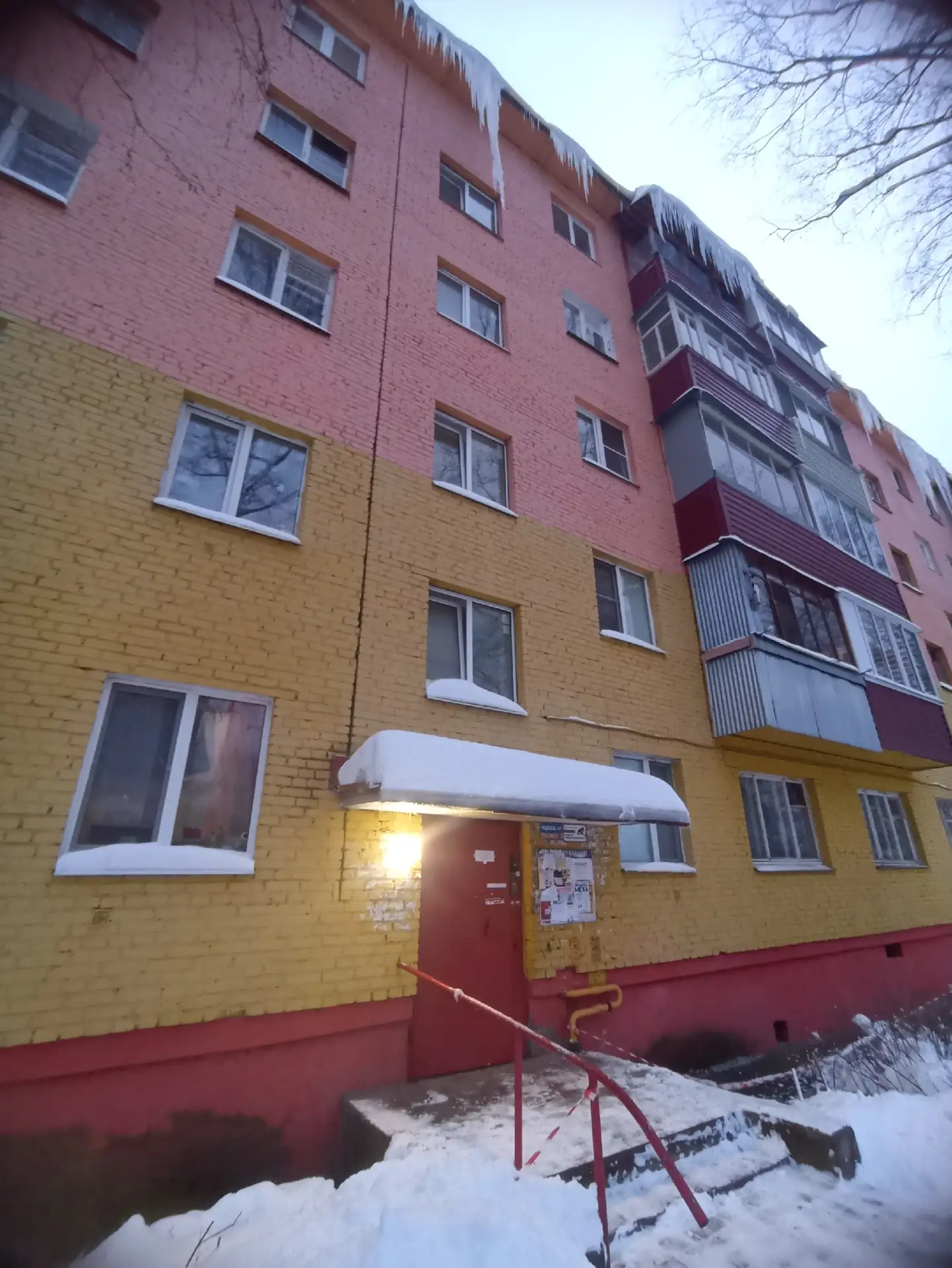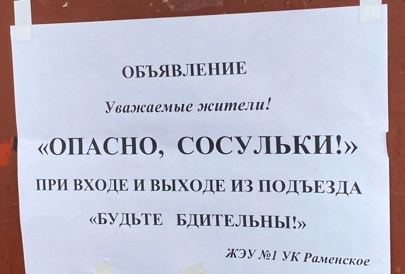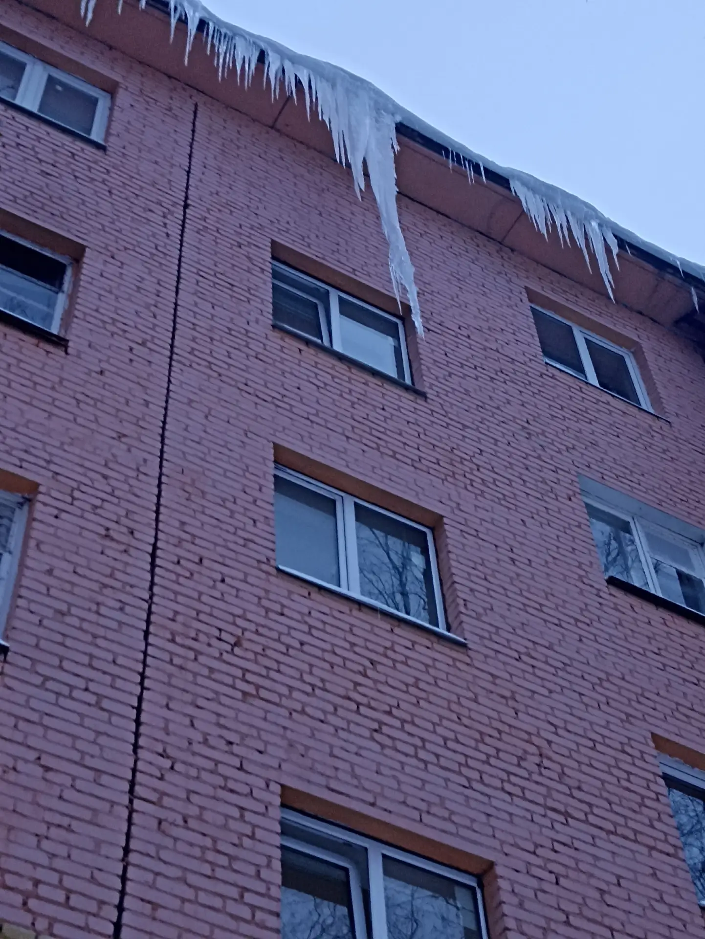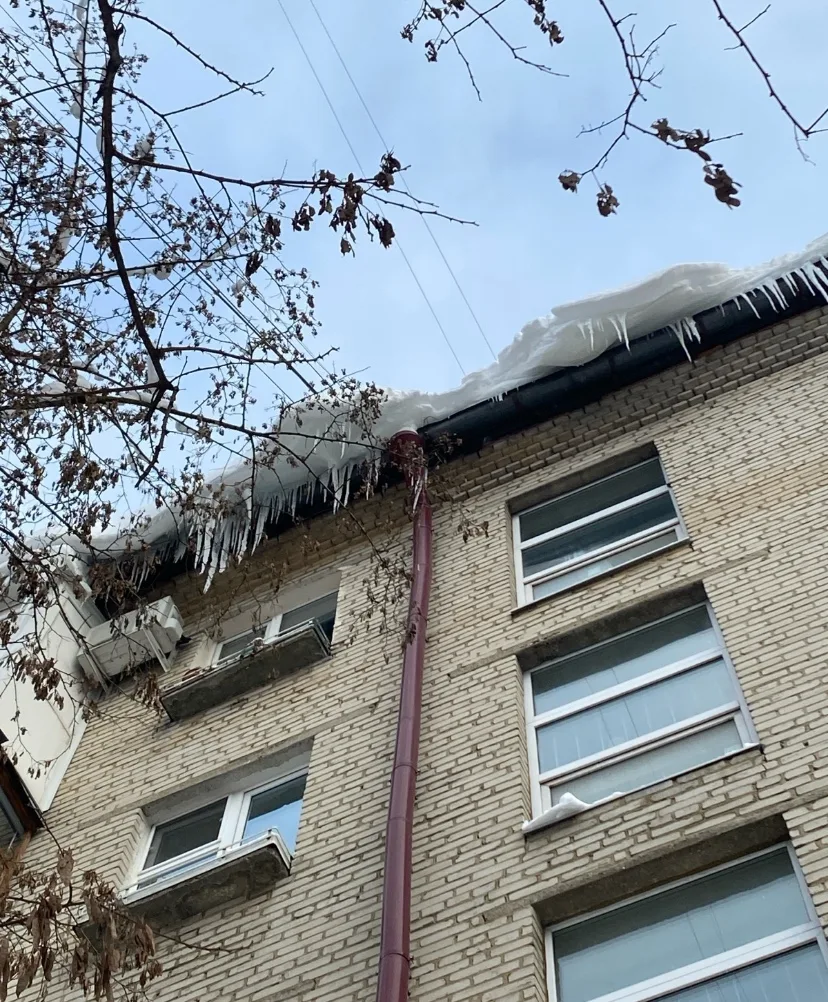 Висят огромные сосульки прямо над 2-3 подъездом и не сбивают. Не дай Бог, такая прилетит — будет трагедия.