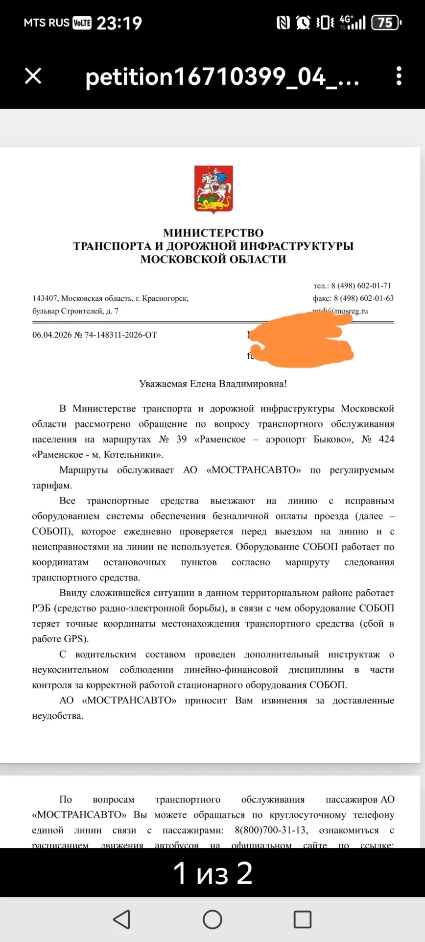 Я написала жалобу в Министерство транспорта МО, на что мне ответили, что автобусы выходят на линию с исправным оборудованием, а такие проблемы из-за того, что работает система РЭБ.