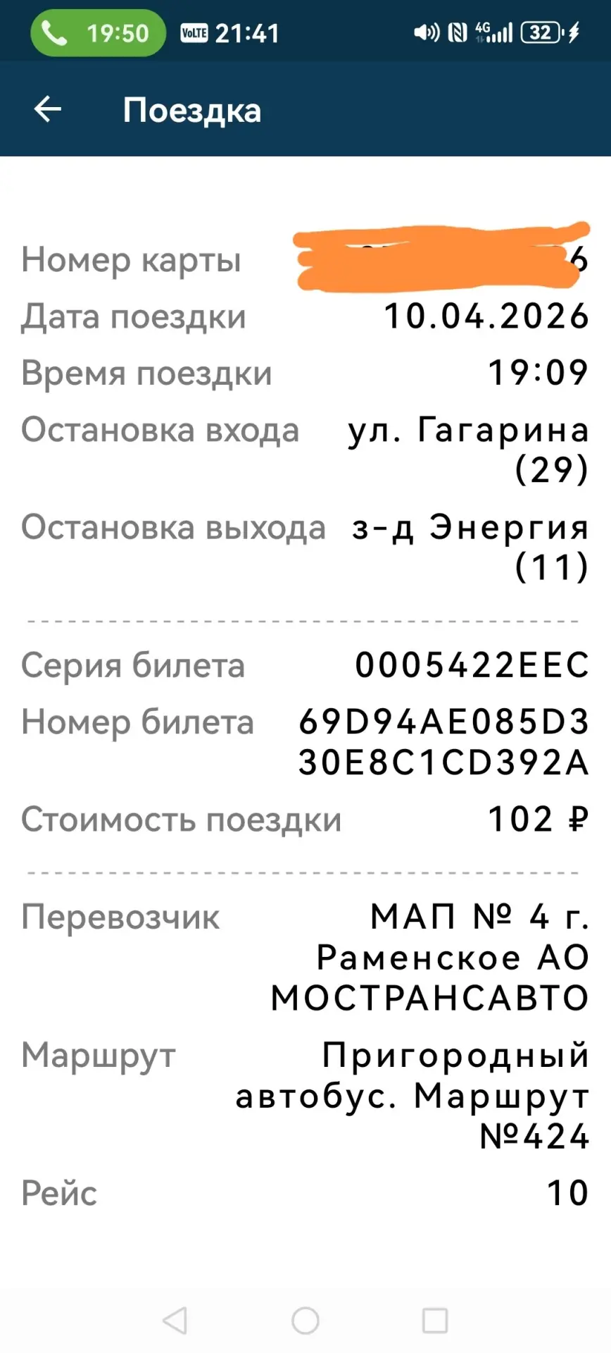 10.04.26 — снова ночная смена, тот же маршрут, и при выходе — 102 рубля.