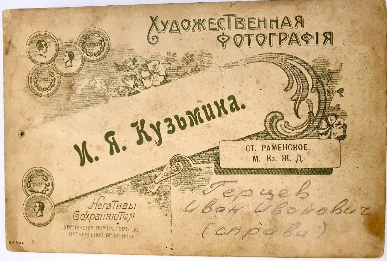 Справа: Иван Иванович Герцев (1889-1948 гг.). После войны Иван вернулся в г. Раменское, жил в своём доме на ул. Центральная, служил в РЖД.