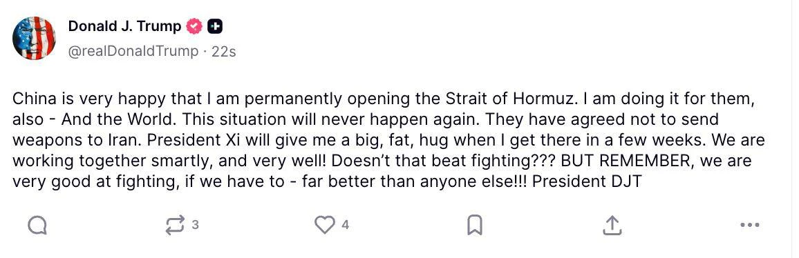 Китай очень рад, что я навсегда открываю Ормузский пролив. Я делаю это для них, а также для всего мира
