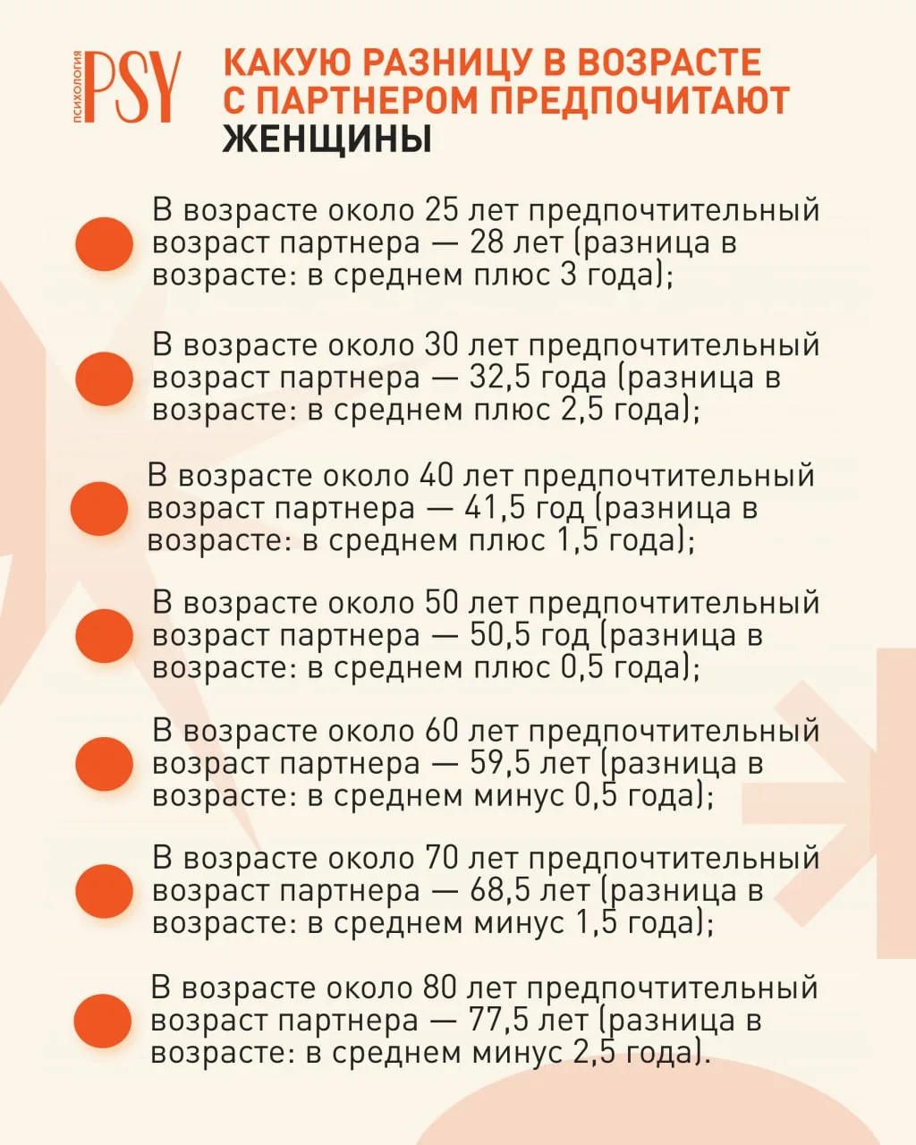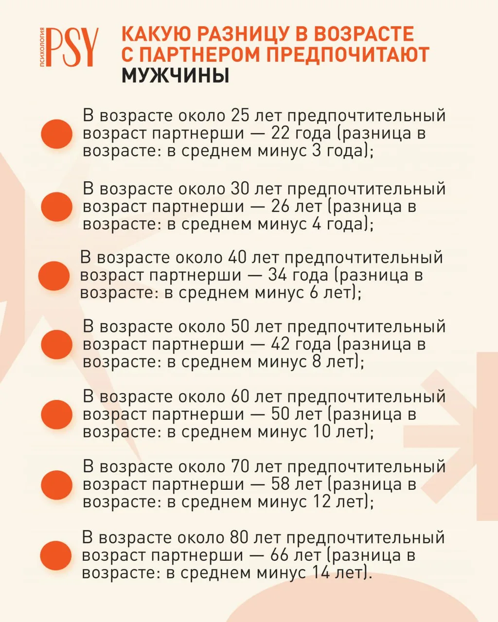 🤵🏼Мужчины: с возрастом они все чаще предпочитают молодого партнера. Чем старше мужчина, тем большую разницу в возрасте он выбирает, в среднем на каждые дополнительные 5 лет возраста мужчины приходится увеличение предпочтительной разницы в возрасте между ним и новой партнершей примерно на 1 дополнительный год.