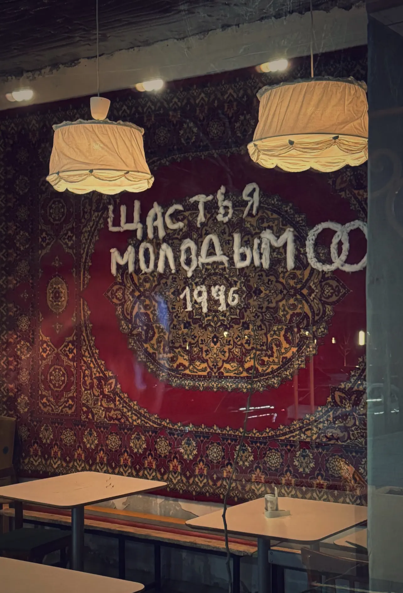 Щастья молодым! Оформление одного из столичных кафе возвращает прямиком в юность. Эх, где эти свадьбы во дворах, невесты с начесом налево и дагестанские ковры с поздравлениями из ваты?