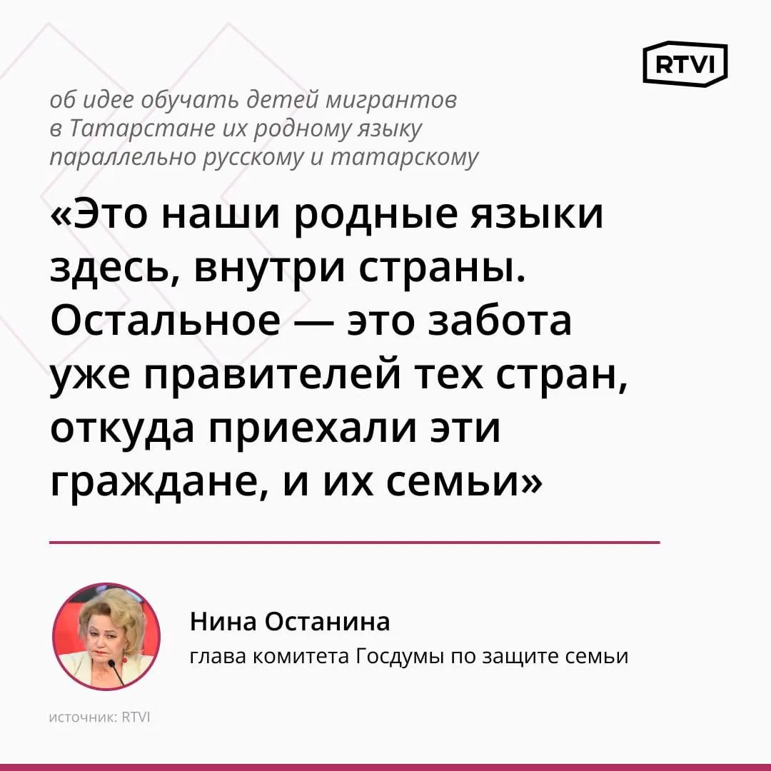Так глава комитета Госдумы по защите семьи Нина Останина прокомментировала слова спикера Госсовета Татарстана Фарида Мухаметшина о том, что в республике думают над тем, как организовать обучение родным языкам для детей и внуков узбеков, таджиков, казахов и кыргызов.