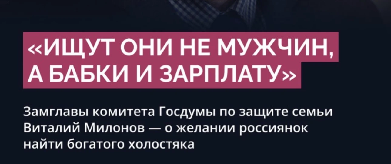 💬 «Вряд ли она готова надеть унты, шапку-ушанку, меховую шубу и ехать с ним туда [в регионы, где добывают нефть и газ]. Нет, она готова просто бабки получать, для Instagram* сниматься и так далее. Поэтому призываю мужчин обращать внимание не на накаченность губ и шаблонное поведение личинки в Instagram*, а на человека, на ее поведение», — призвал он.