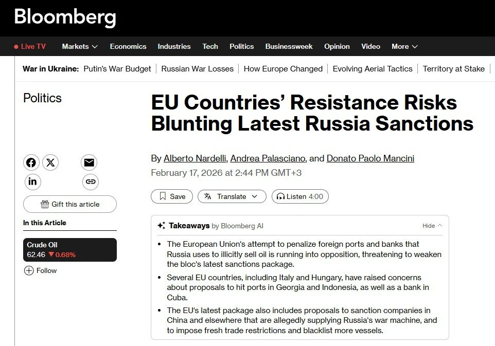 В ЕС возникли разногласия по 20-му пакету санкций против России — Bloomberg