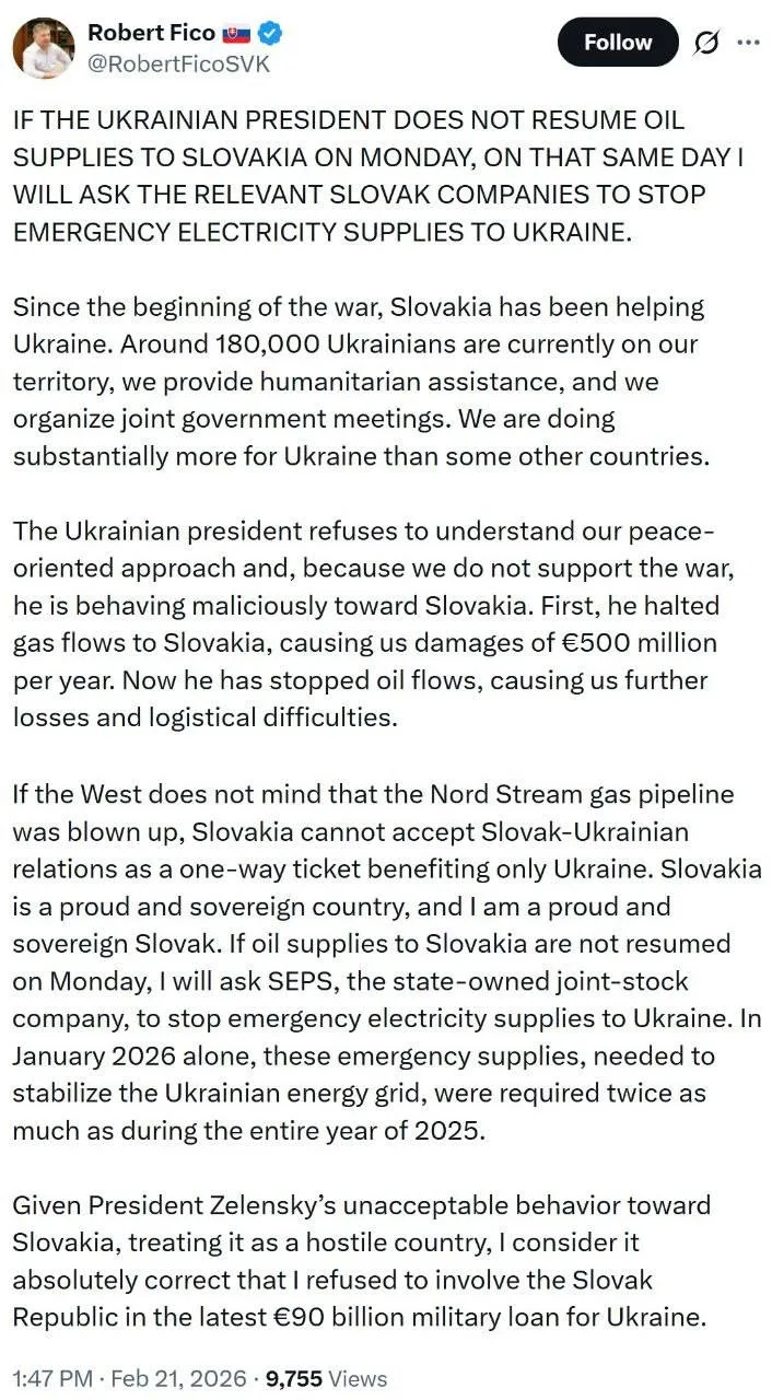 Он отметил, что Киев сначала остановил поставки газа в Словакию, причинив стране ущерб в размере €500 млн в год, а теперь прекратил поставки нефти. Это приводит к дальнейшим убыткам и создает логистические трудности, пожаловался Фицо