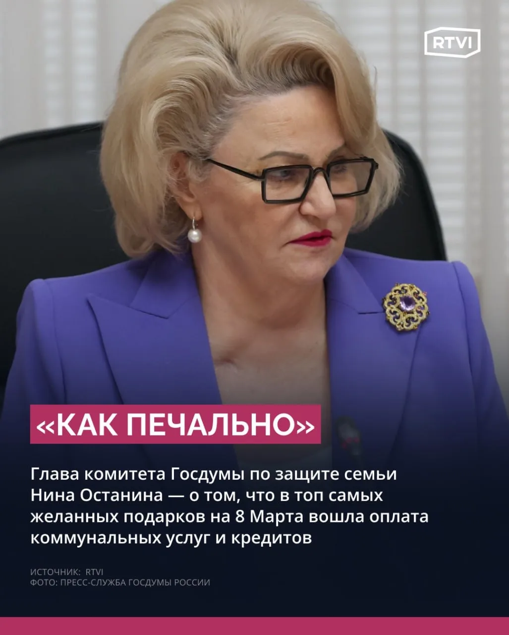 💬 «Действительно, если оплата счетов за коммуналку вошла у нас в топ подарков, я думаю, что хорошо, если бы власть к 8 Марта не только нашим женщинам, а вообще нашим российским семьям все-таки снизошла до такого подарка. Это было бы замечательно», — сказала она.