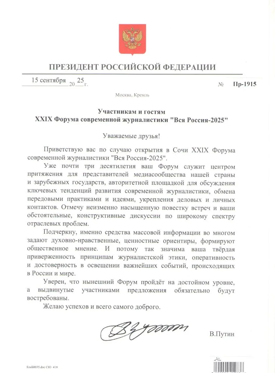 Президент РФ Владимир Путин поприветствовал участников Форума современной журналистики «Вся Россия»