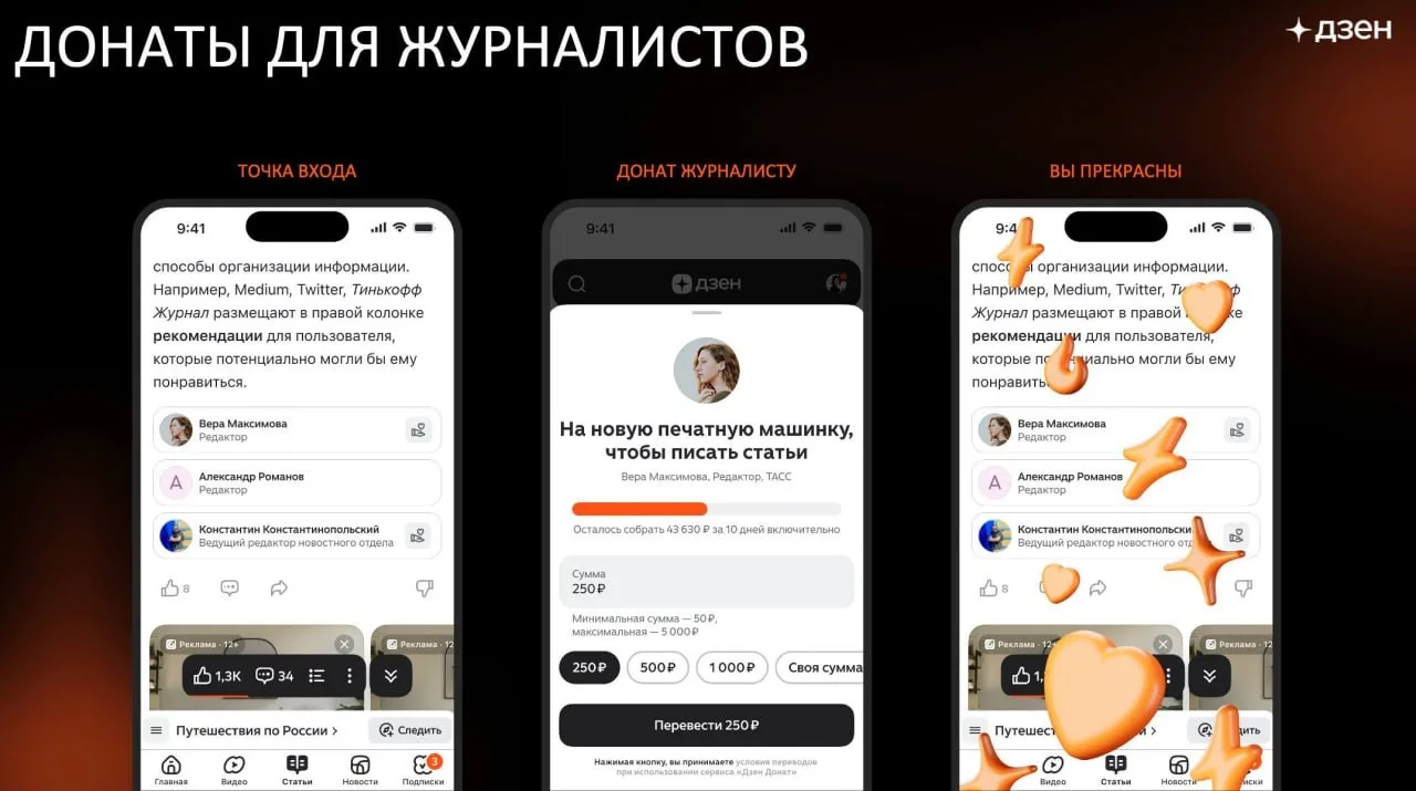 · Внедрение системы донатов для журналистов, позволяющей читателям напрямую поддерживать авторов (суммы от 50 до 5000 рублей).