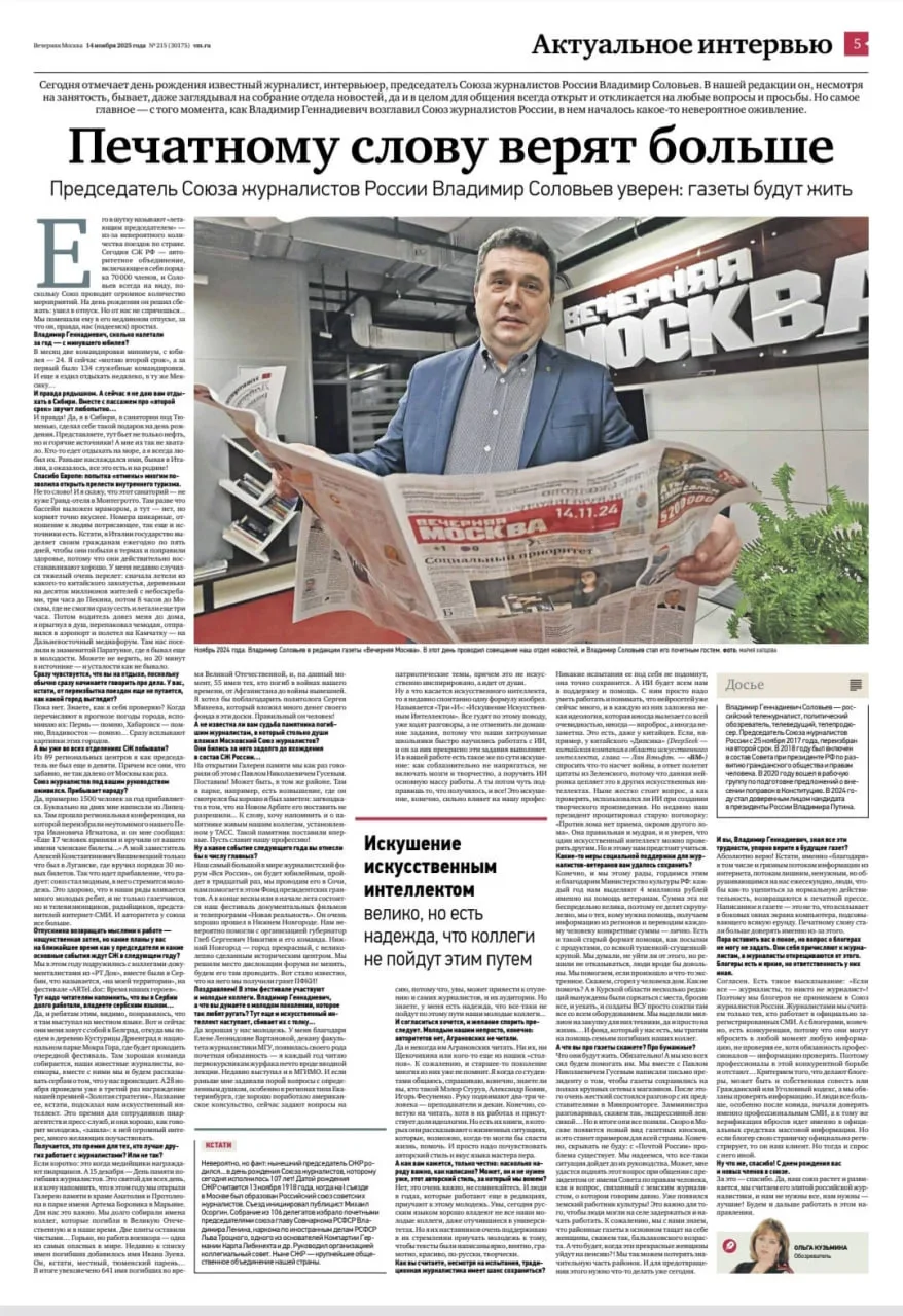 В канун дня рождения глава СЖР Владимир Соловьев дал большое интервью газете "Вечерняя Москва"