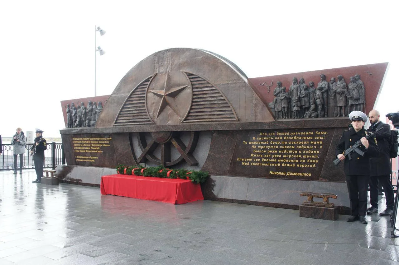 🖥 Монумент установлен на набережной реки Камы, куда в годы Великой Отечественной войны прибывали баржи и пароходы. Он состоит из плиты со стилизованным силуэтом речного колесного судна парохода «Вера Фигнер». Его детали обнаружили в 2020 году пермские водолазы.
