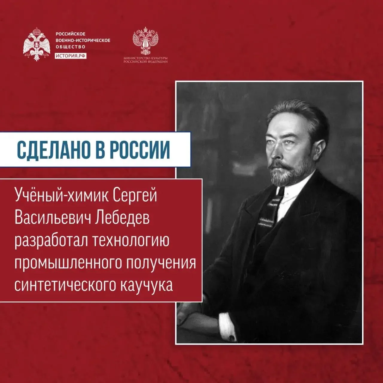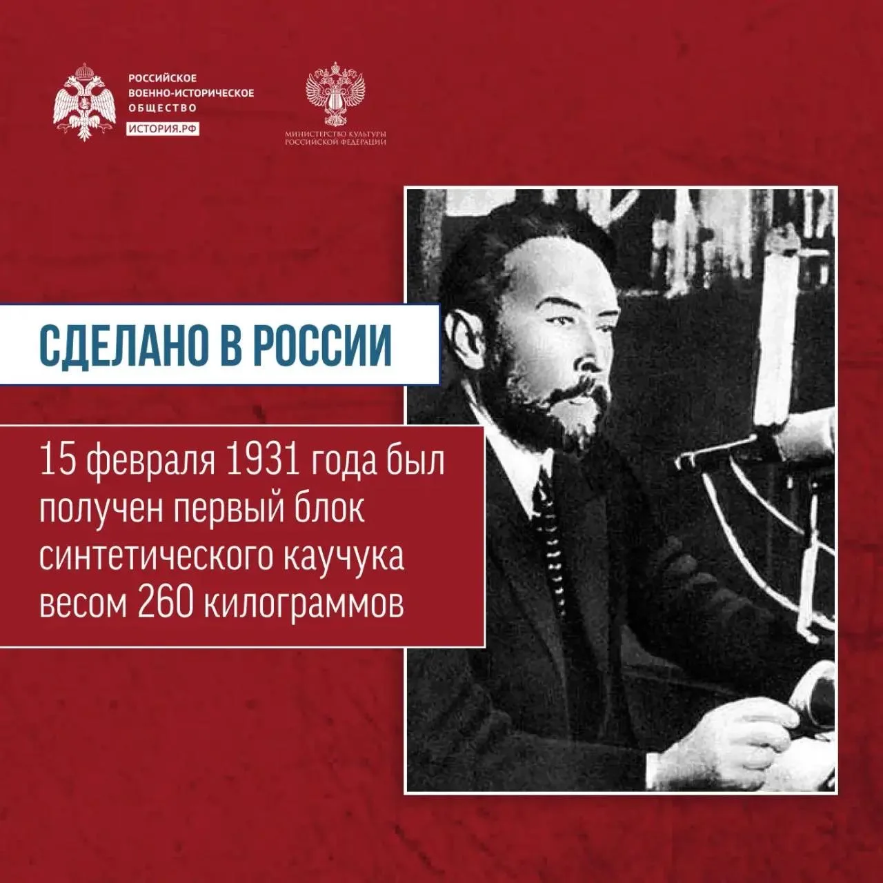 ℹ️ Учёный-химик Сергей Васильевич Лебедев первым в мире разработал технологию промышленного получения синтетического каучука. 15 февраля 1931 года был получен первый блок этого материала весом 260 килограммов
