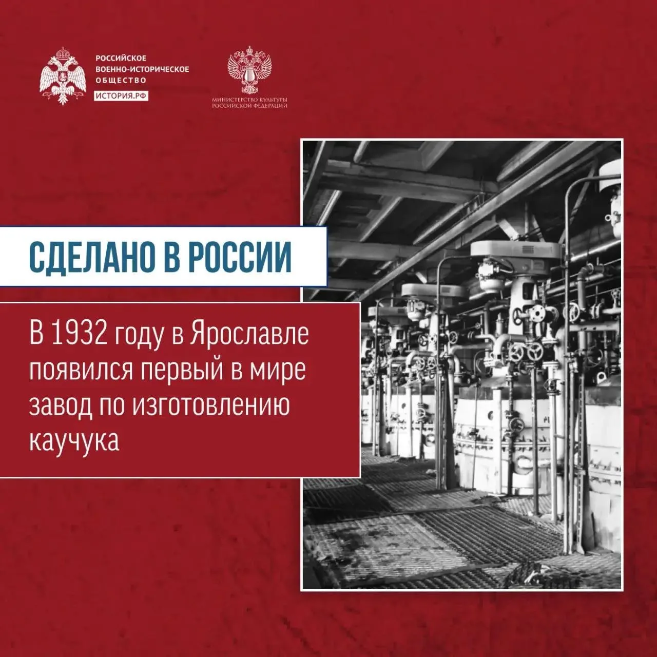 В 1932 году в Ярославле появился первый в мире завод по изготовлению каучука. В настоящее время этот материал используют для производства шин, различных уплотнителей и напольных покрытий.