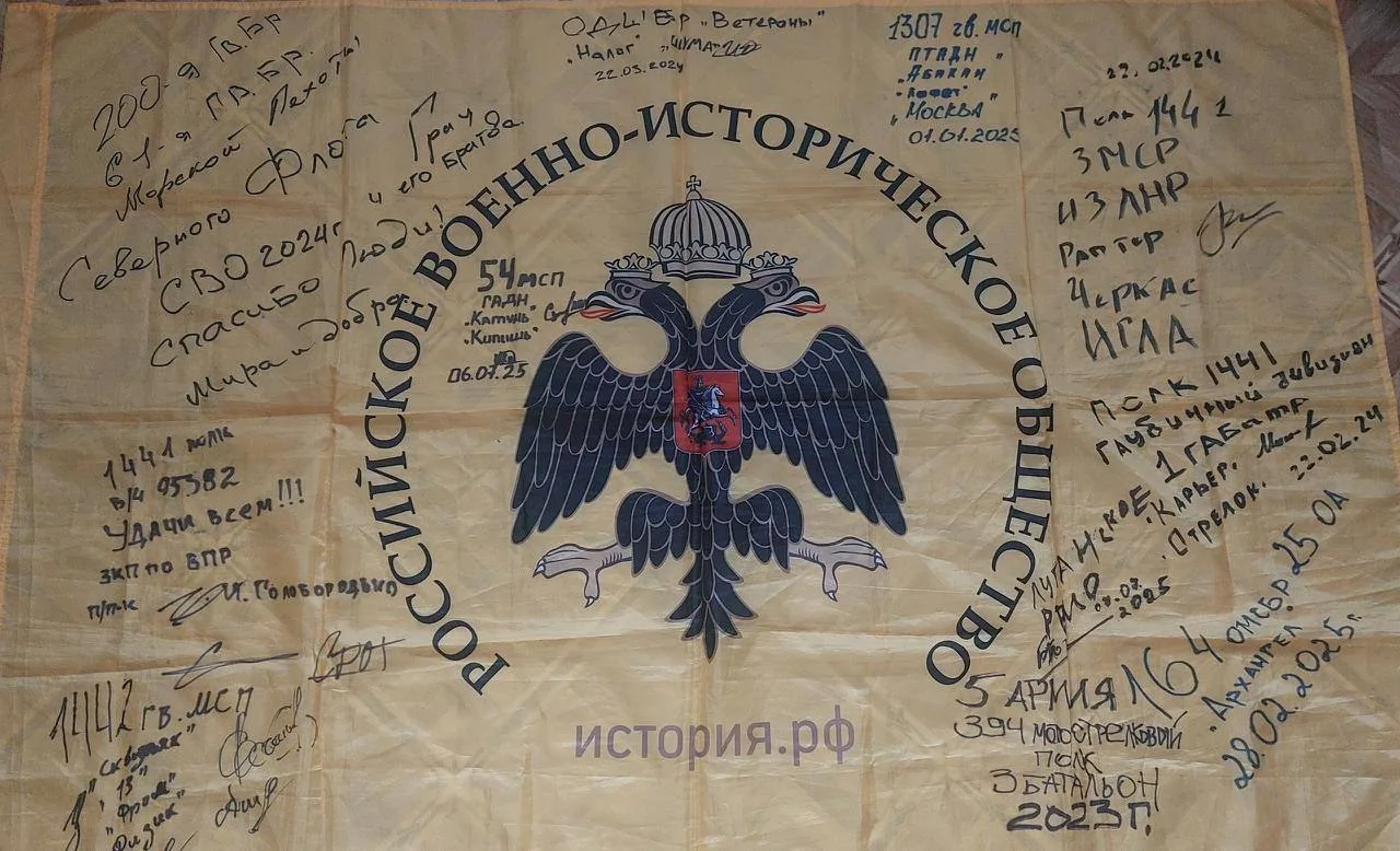 Этот флаг РВИО вместе с Юрием Проскуриным побывал на линии боевого соприкосновения в Запорожской области, ДНР и ЛНР. Десятки Героев оставили на нем свой автограф. К сожалению, некоторых уже нет в живых.