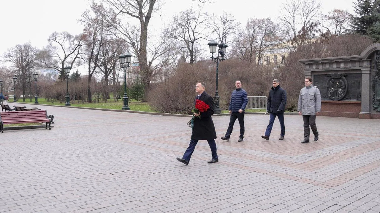 В памятный день помощник Владимир Мединский возложил цветы к памятнику Александру I в Александровском саду в Москве.