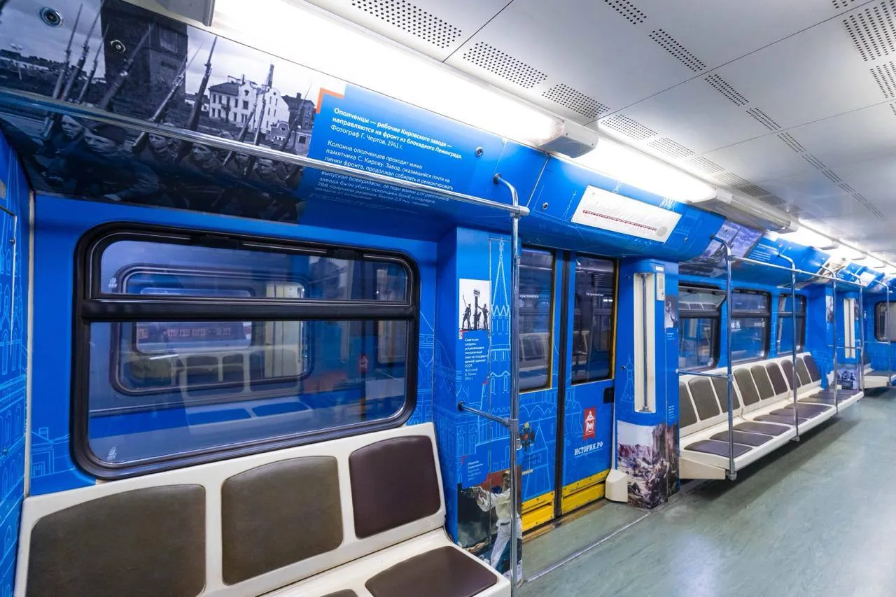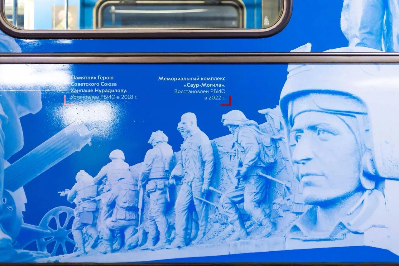 Сегодня он отправился в первый рейс на Сокольнической линии. В его оформление вошли изображения новых учебников истории, а также мемориалов, установленных или отреставрированных РВИО: Саур-Могила, Ржевский мемориал Советскому солдату, Князь Александр Невский с дружиной, памятник Героям Первой мировой войны.