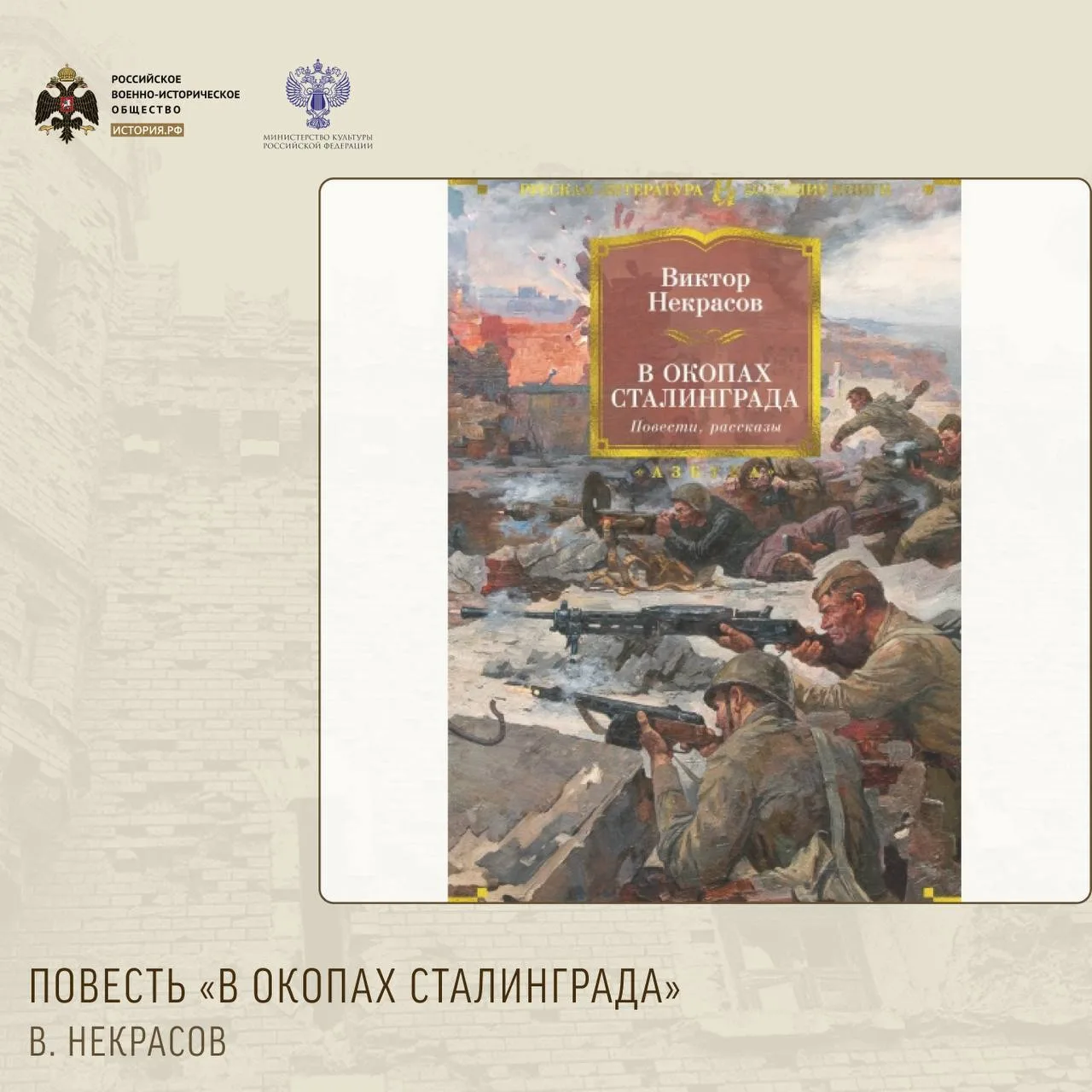 Повесть «В окопах Сталинграда». В. Некрасов. Произведение рассказывает о героической обороне Сталинграда Красной армией от наступавших военных сил Германии и её союзников в 1942–1943 годах.