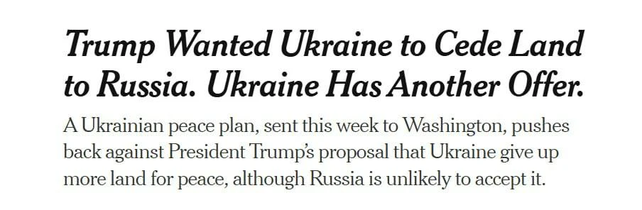 ‼️🇺🇦🇺🇸Украинская версия мирного плана, отправленная в США, отвергает вывод войск из Донбасса и отказ от НАТО, – NYT