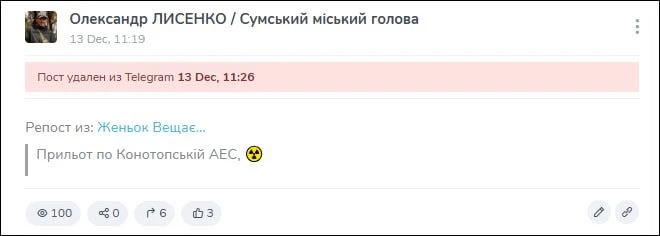 ‼️🇺🇦😁 Глава Сум репостнул сообщение об ударе по несуществующей "Конотопской АЭС"