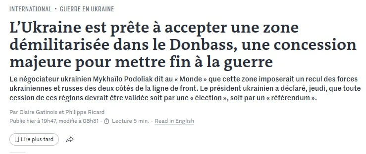 ‼️🇷🇺🇺🇦 Киев согласен на вывод ВСУ и создание буферной зоны на Донбассе, — Le Monde